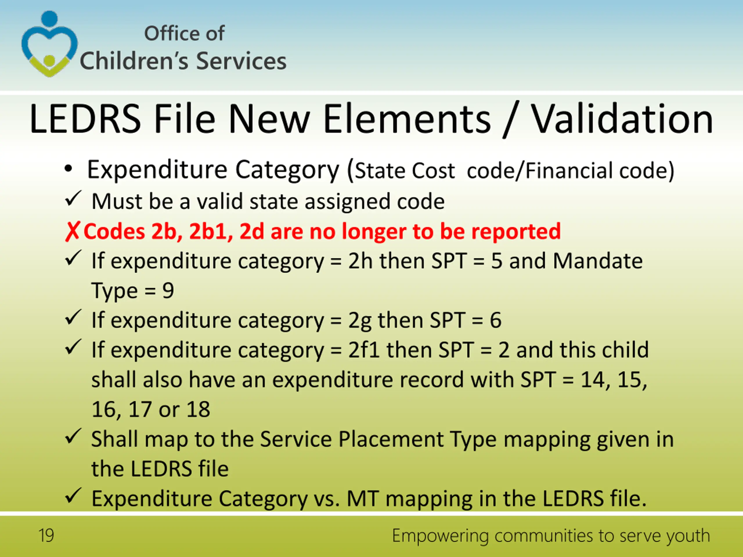 Office of Children s Services LEDRS File New Elements / Validation Transaction Code A code assigned for the transaction. It characterizes the transaction type. For CSA Funding Debits: 1, 8 Credits: 2, 3, 4, 5, 6, 7, 10 For Title IV-E Funding Debits: 1, 7 Credits: 2, 3, 4, 5, 6, 8, 10 Transaction Description Explanation of reason for the adjustment, when the code is Other-Credits / Other-Debits Mandatory if Transaction Code = 10, 11 18 Empowering communities to serve youth