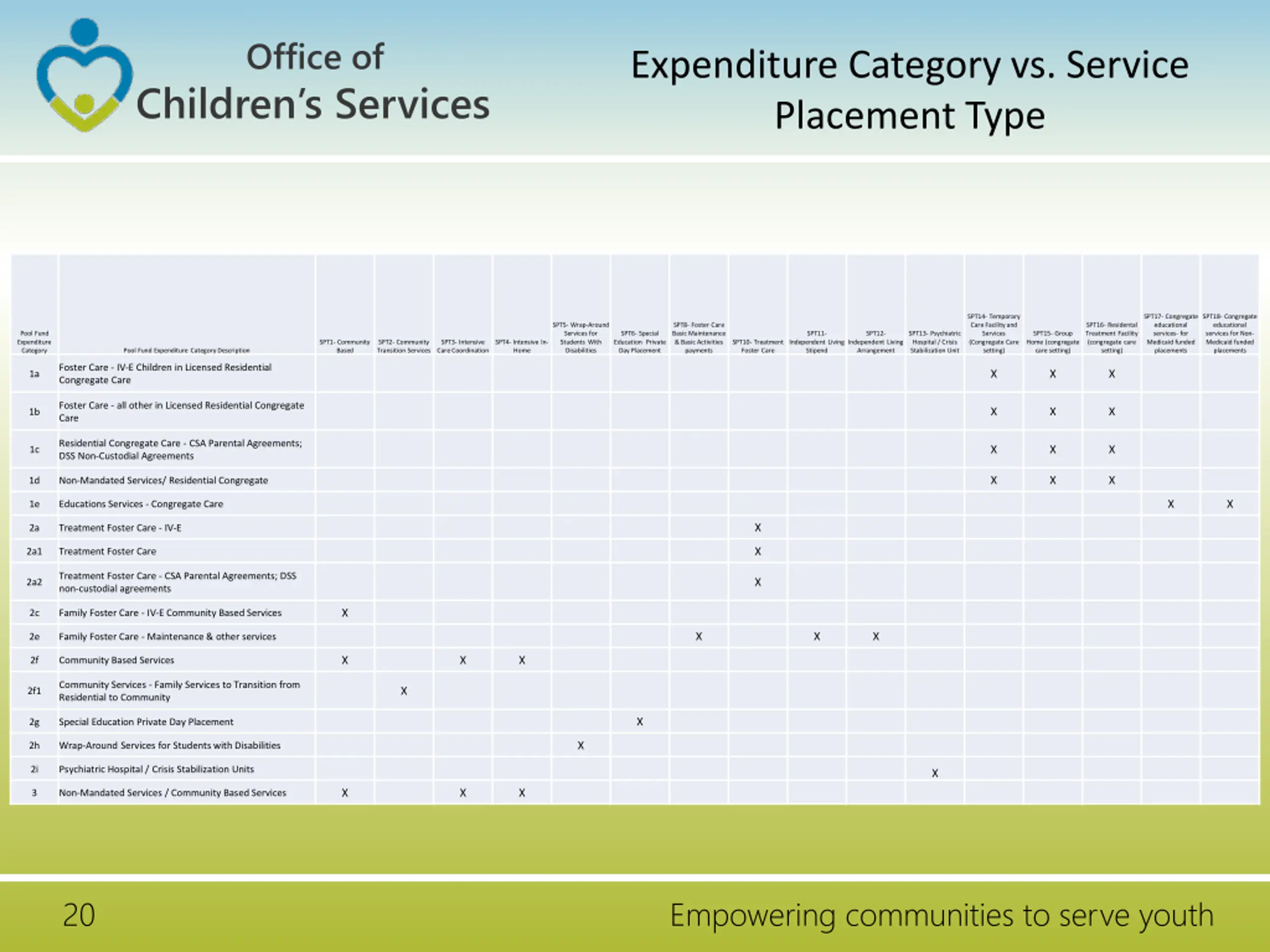 Office of Expenditure Category vs. Service Placement Type Children s Services SPT14- Temporary Care Facility and Services (Congregate Care setting) SPT17- Congregate educational services- for Medicaid funded placements SPT18- Congregate educational services for Non- Medicaid funded placements SPT5- Wrap-Around Services for Students With Disabilities SPT8- Foster Care Basic Maintenance & Basic Activities payments SPT16- Residental Treatment Facility (congregate care setting) Pool Fund Expenditure Category SPT6- Special Education Private Day Placement SPT11- SPT12- SPT13- Psychiatric Hospital / Crisis Stabilization Unit SPT15- Group Home (congregate care setting) SPT1- Community Based SPT2- Community Transition Services SPT3- Intensive Care Coordination SPT4- Intensive In- Home SPT10- Treatment Foster Care Independent Living Stipend Independent Living Arrangement Pool Fund Expenditure Category Description Foster Care - IV-E Children in Licensed Residential Congregate Care X X X 1a Foster Care - all other in Licensed Residential Congregate Care X X X 1b Residential Congregate Care - CSA Parental Agreements; DSS Non-Custodial Agreements X X X 1c X X X 1d Non-Mandated Services/ Residential Congregate X X 1e Educations Services - Congregate Care X 2a Treatment Foster Care - IV-E X 2a1 Treatment Foster Care Treatment Foster Care - CSA Parental Agreements; DSS non-custodial agreements X 2a2 X 2c Family Foster Care - IV-E Community Based Services X X X 2e Family Foster Care - Maintenance & other services X X X 2f Community Based Services Community Services - Family Services to Transition from Residential to Community X 2f1 X 2g Special Education Private Day Placement X 2h Wrap-Around Services for Students with Disabilities 2i Psychiatric Hospital / Crisis Stabilization Units X X X X 3 Non-Mandated Services / Community Based Services 20 Empowering communities to serve youth