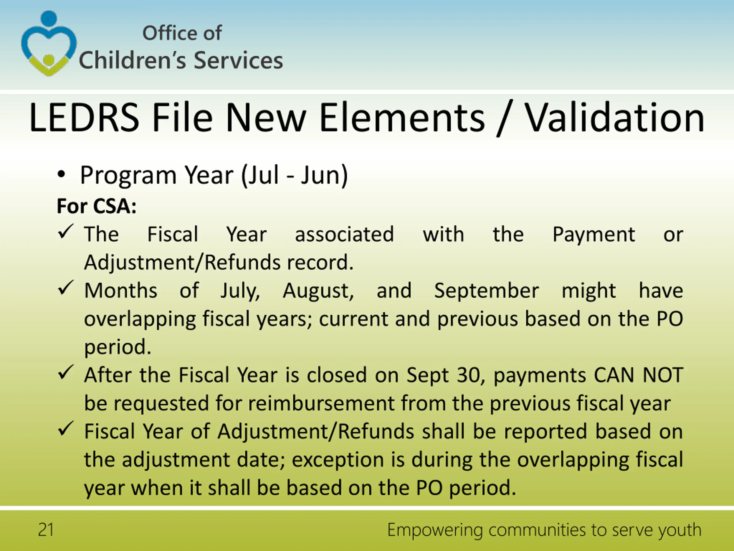Office of Children s Services LEDRS File New Elements / Validation Program Year (Jul - Jun) For CSA: The Fiscal Adjustment/Refunds record. Months of July, August, and September might have overlapping fiscal years; current and previous based on the PO period. After the Fiscal Year is closed on Sept 30, payments CAN NOT be requested for reimbursement from the previous fiscal year Fiscal Year of Adjustment/Refunds shall be reported based on the adjustment date; exception is during the overlapping fiscal year when it shall be based on the PO period. Year associated with the Payment or 21 Empowering communities to serve youth