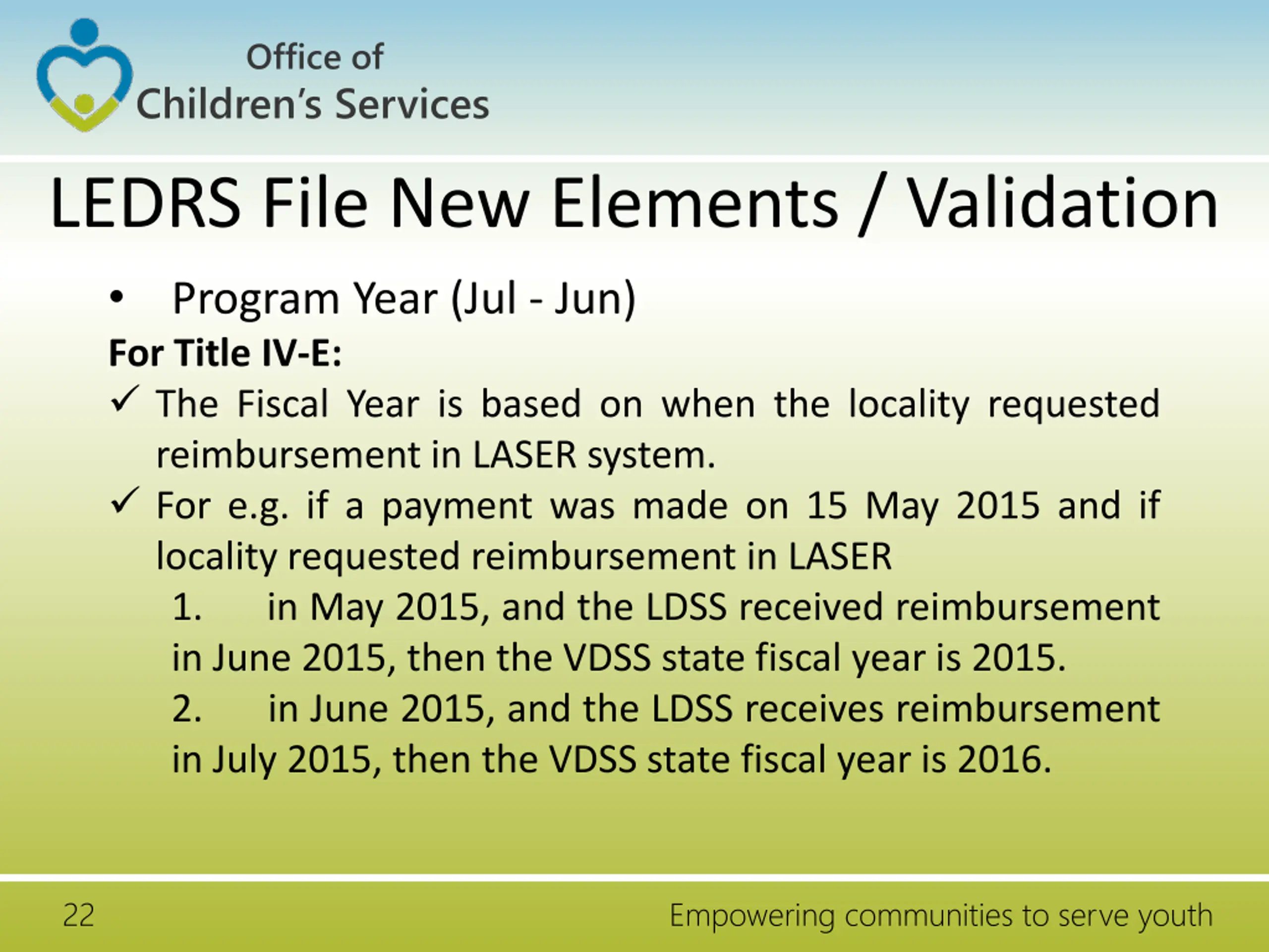 Office of Children s Services LEDRS File New Elements / Validation Program Year (Jul - Jun) For Title IV-E: The Fiscal Year is based on when the locality requested reimbursement in LASER system. For e.g. if a payment was made on 15 May 2015 and if locality requested reimbursement in LASER 1. in May 2015, and the LDSS received reimbursement in June 2015, then the VDSS state fiscal year is 2015. 2. in June 2015, and the LDSS receives reimbursement in July 2015, then the VDSS state fiscal year is 2016. 22 Empowering communities to serve youth