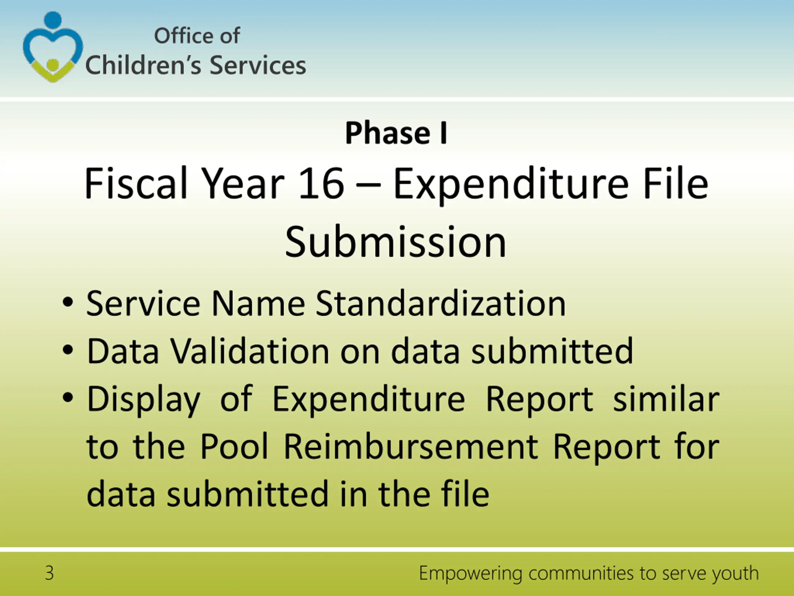 Office of Children s Services Phase I Fiscal Year 16 Expenditure File Submission Service Name Standardization Data Validation on data submitted Display of Expenditure Report similar to the Pool Reimbursement Report for data submitted in the file 3 Empowering communities to serve youth