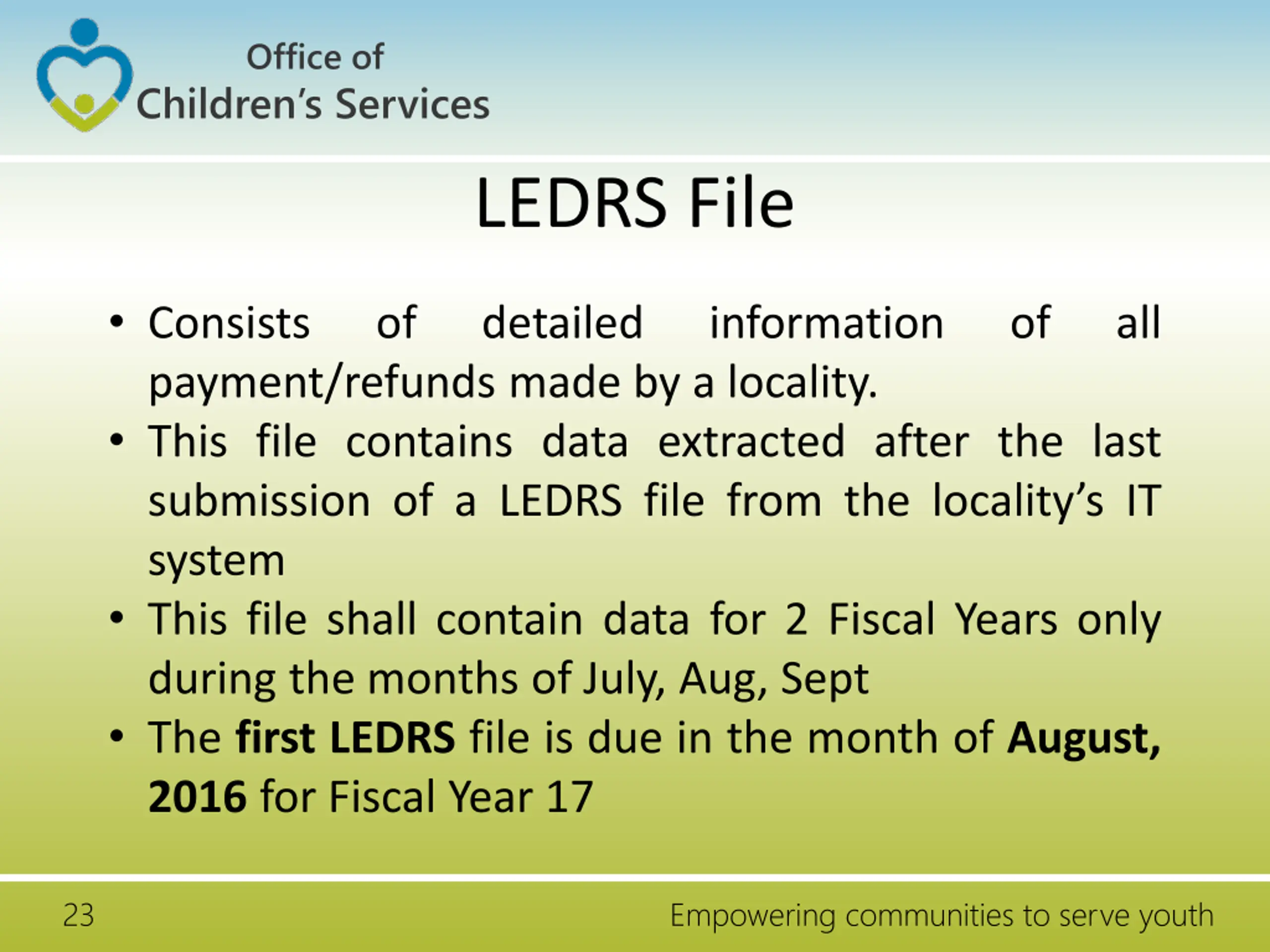 Office of Children s Services LEDRS File Consists payment/refunds made by a locality. This file contains data extracted after the last submission of a LEDRS file from the locality s IT system This file shall contain data for 2 Fiscal Years only during the months of July, Aug, Sept The first LEDRS file is due in the month of August, 2016 for Fiscal Year 17 of detailed information of all 23 Empowering communities to serve youth