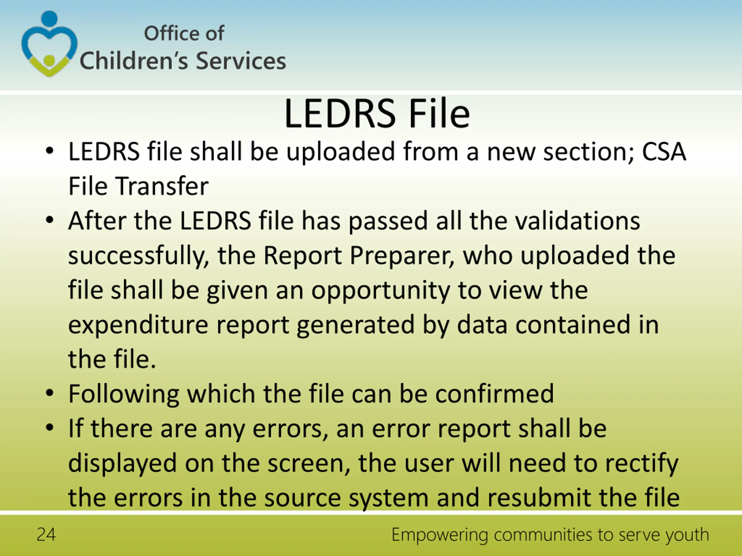 Office of Children s Services LEDRS File LEDRS file shall be uploaded from a new section; CSA File Transfer After the LEDRS file has passed all the validations successfully, the Report Preparer, who uploaded the file shall be given an opportunity to view the expenditure report generated by data contained in the file. Following which the file can be confirmed If there are any errors, an error report shall be displayed on the screen, the user will need to rectify the errors in the source system and resubmit the file 24 Empowering communities to serve youth