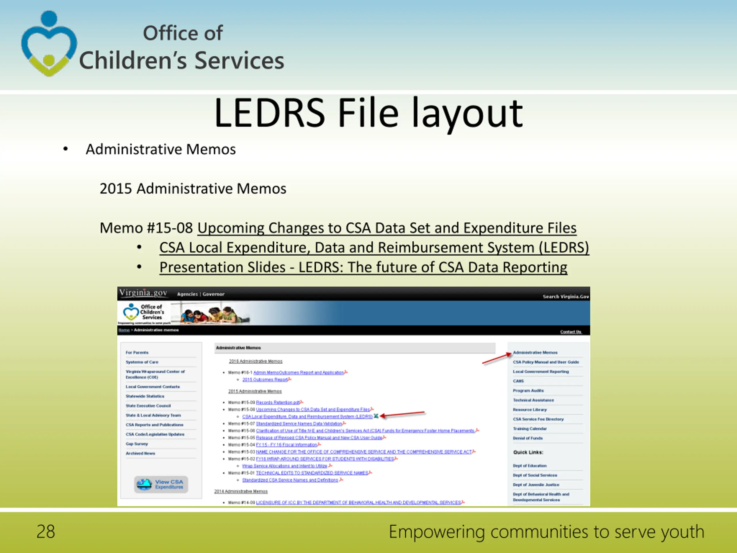 Office of Children s Services LEDRS File layout Administrative Memos 2015 Administrative Memos Memo #15-08 Upcoming Changes to CSA Data Set and Expenditure Files CSA Local Expenditure, Data and Reimbursement System (LEDRS) Presentation Slides - LEDRS: The future of CSA Data Reporting 28 Empowering communities to serve youth