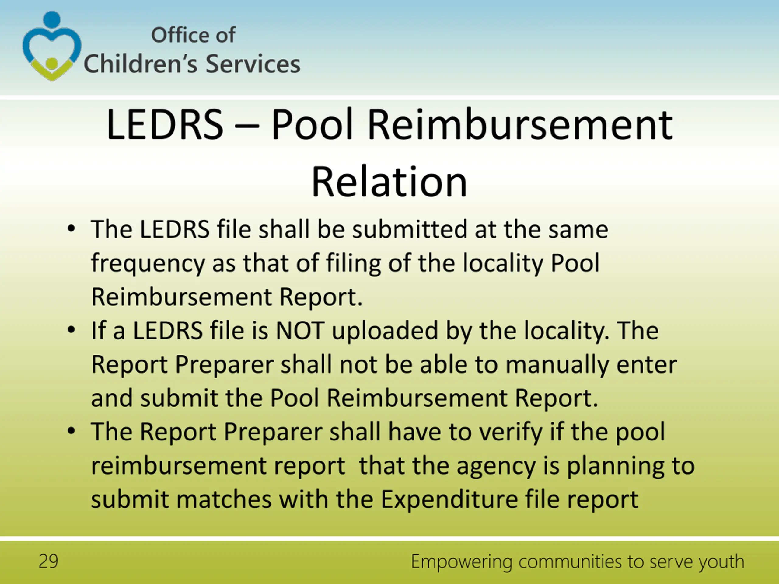 Office of Children s Services LEDRS Pool Reimbursement Relation The LEDRS file shall be submitted at the same frequency as that of filing of the locality Pool Reimbursement Report. If a LEDRS file is NOT uploaded by the locality. The Report Preparer shall not be able to manually enter and submit the Pool Reimbursement Report. The Report Preparer shall have to verify if the pool reimbursement report that the agency is planning to submit matches with the Expenditure file report 29 Empowering communities to serve youth