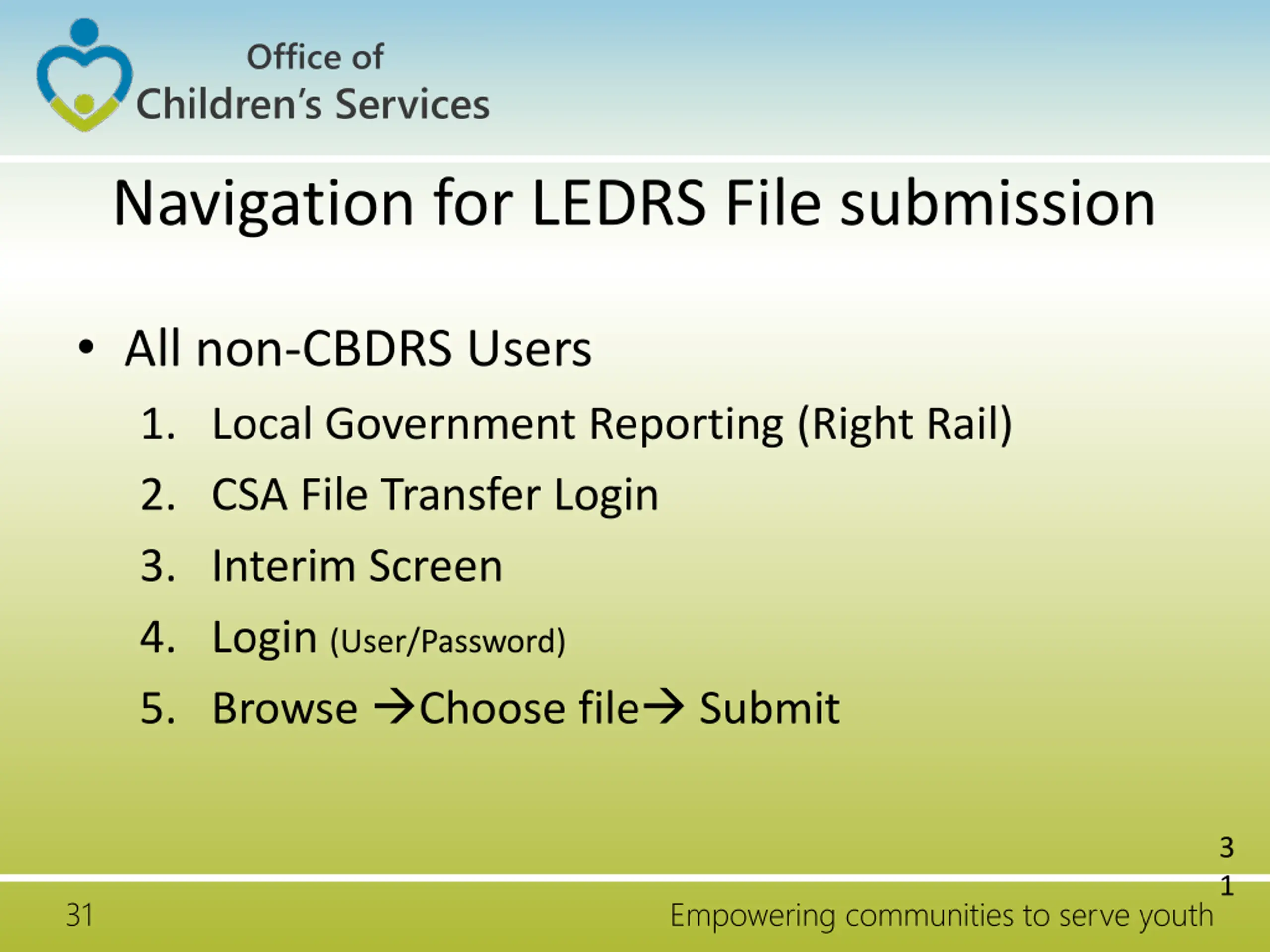 Office of Children s Services Navigation for LEDRS File submission All non-CBDRS Users 1. Local Government Reporting (Right Rail) 2. CSA File Transfer Login 3. Interim Screen 4. Login (User/Password) 5. Browse Choose file Submit 3 1 31 Empowering communities to serve youth