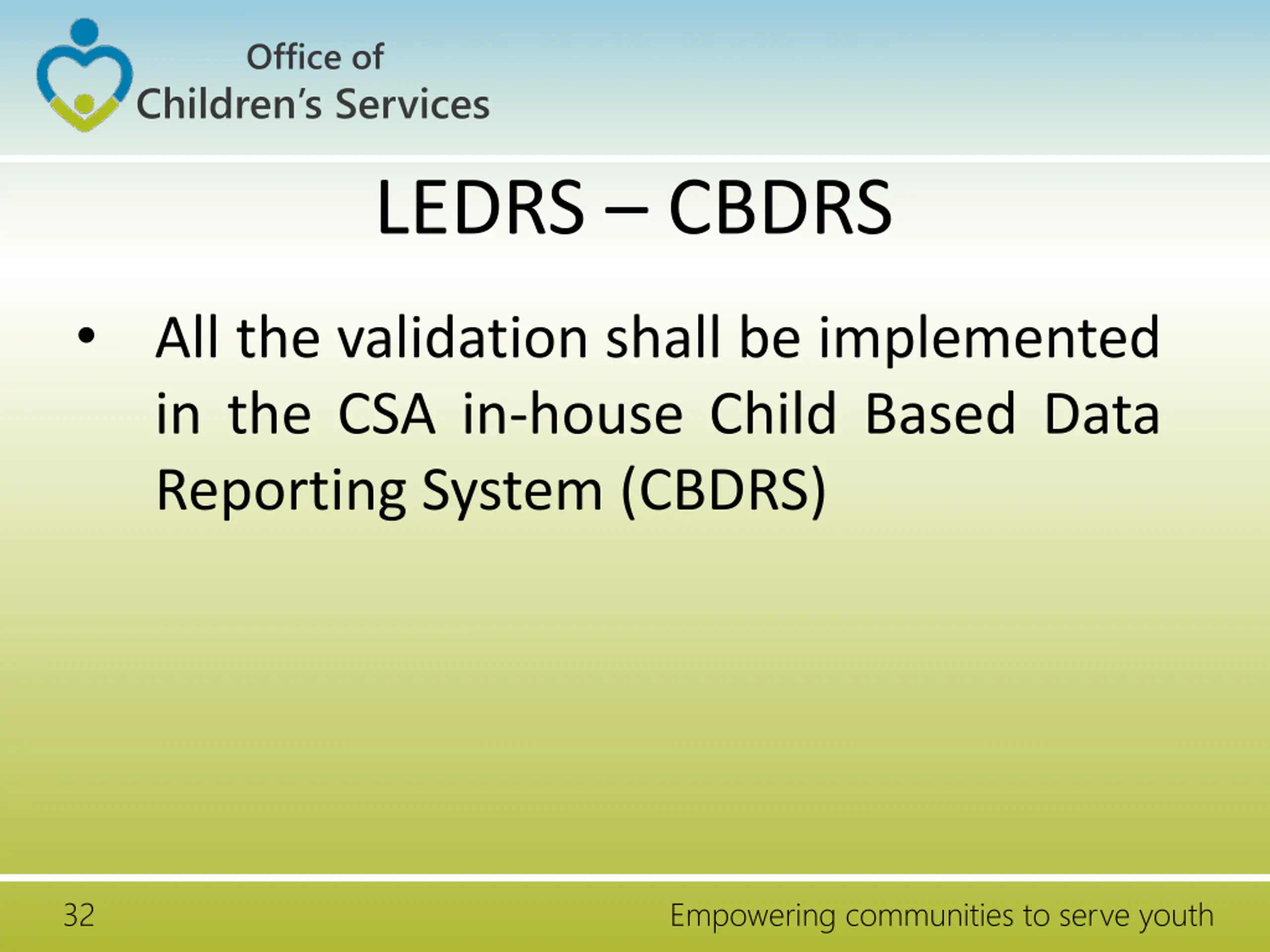 Office of Children s Services LEDRS CBDRS All the validation shall be implemented in the CSA in-house Child Based Data Reporting System (CBDRS) 32 Empowering communities to serve youth