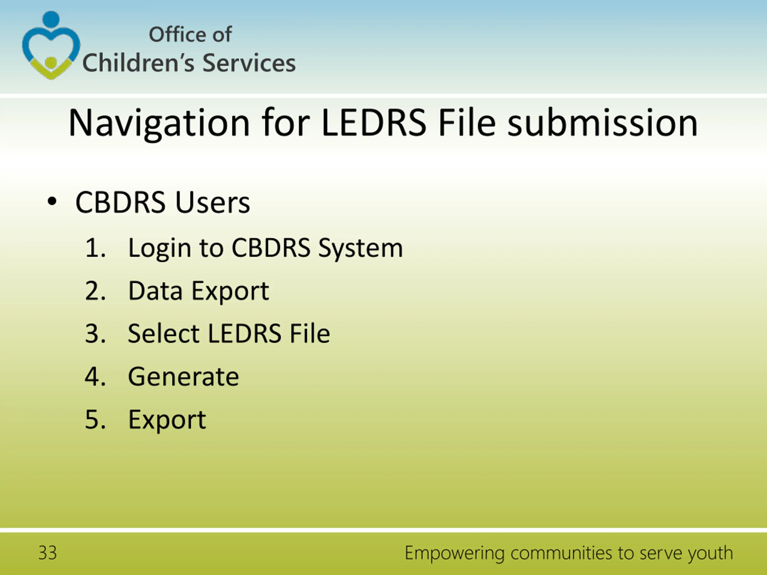 Office of Children s Services Navigation for LEDRS File submission CBDRS Users 1. Login to CBDRS System 2. Data Export 3. Select LEDRS File 4. Generate 5. Export 33 Empowering communities to serve youth