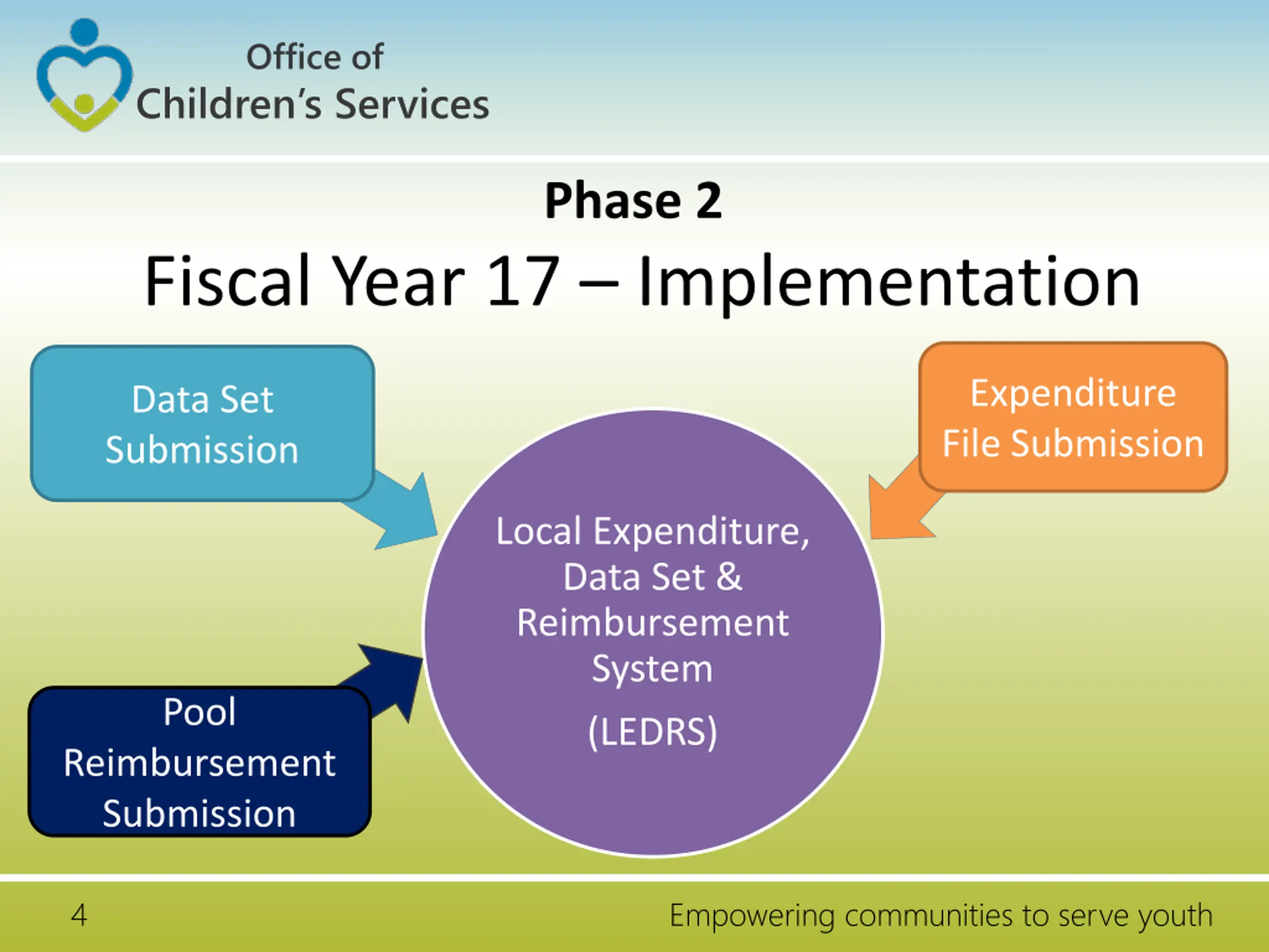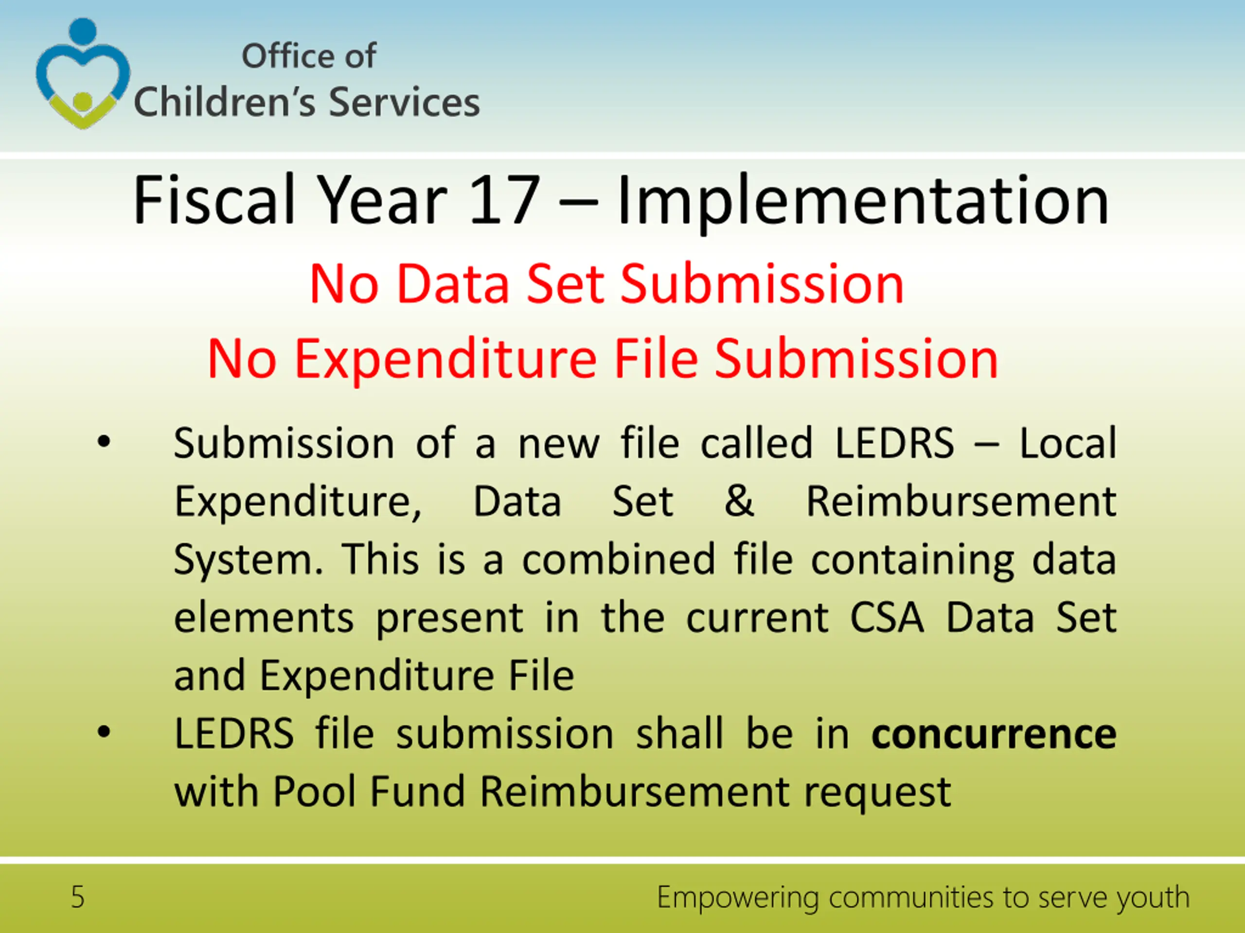 Office of Children s Services Phase 2 Fiscal Year 17 Implementation Expenditure File Submission Data Set Submission Local Expenditure, Data Set & Reimbursement System Pool (LEDRS) Reimbursement Submission 4 Empowering communities to serve youth