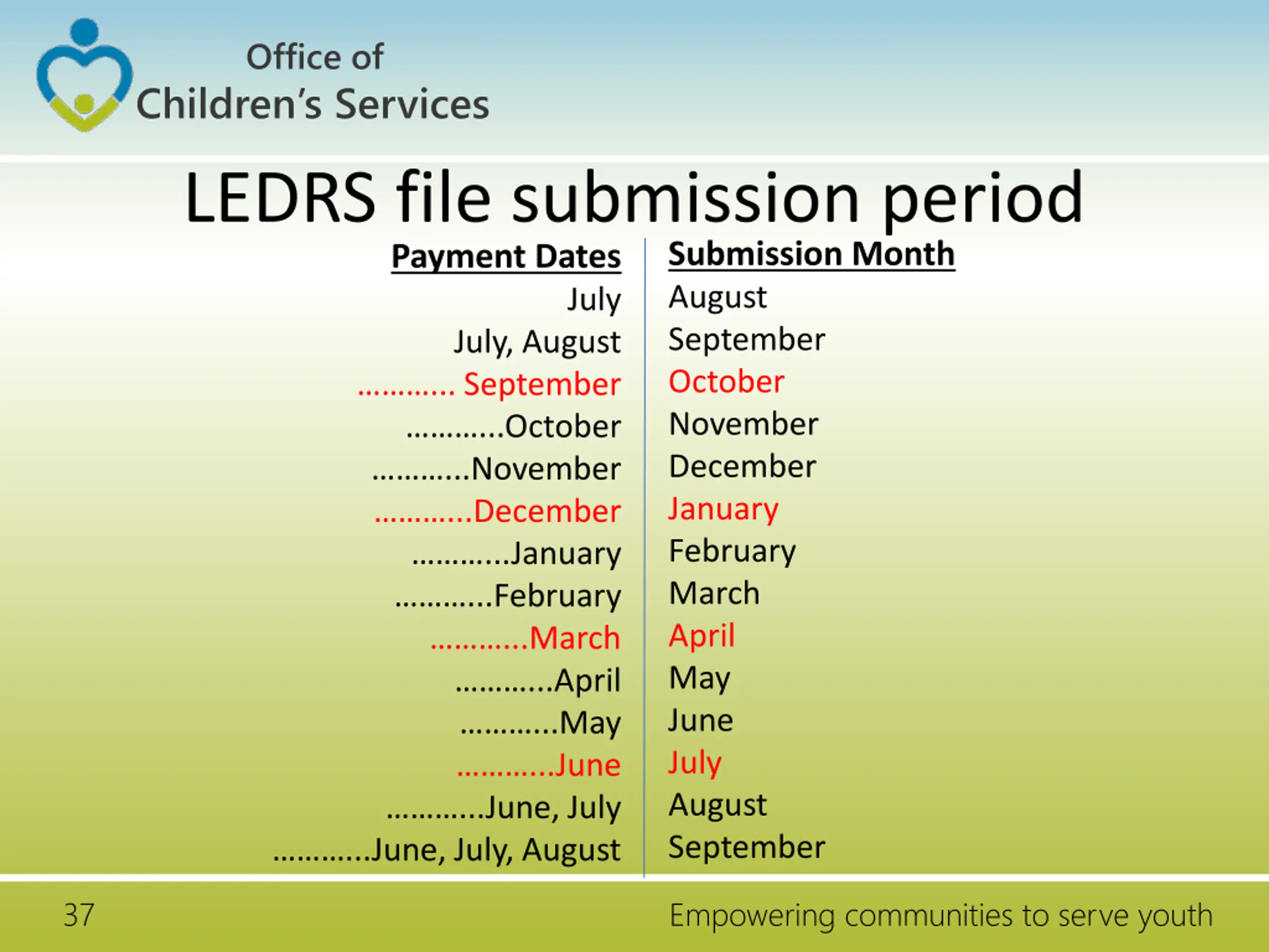Office of Children s Services LEDRS file submission period Payment Dates July July, August ... September ...October ...November ...December ...January ...February ...March ...April ...May ...June ...June, July ...June, July, August Submission Month August September October November December January February March April May June July August September 37 Empowering communities to serve youth