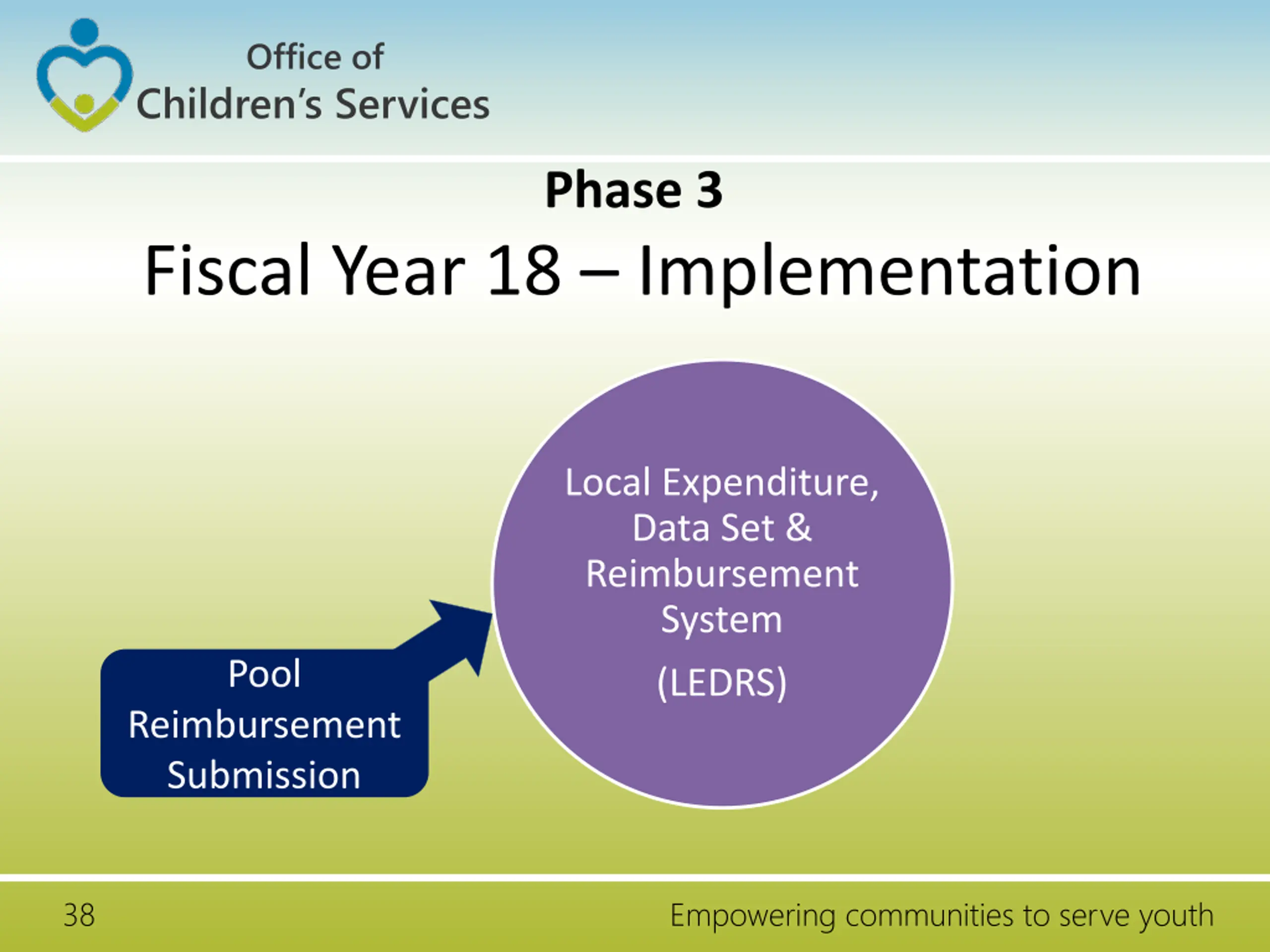Office of Children s Services Phase 3 Fiscal Year 18 Implementation Local Expenditure, Data Set & Reimbursement System Pool (LEDRS) Reimbursement Submission 38 Empowering communities to serve youth