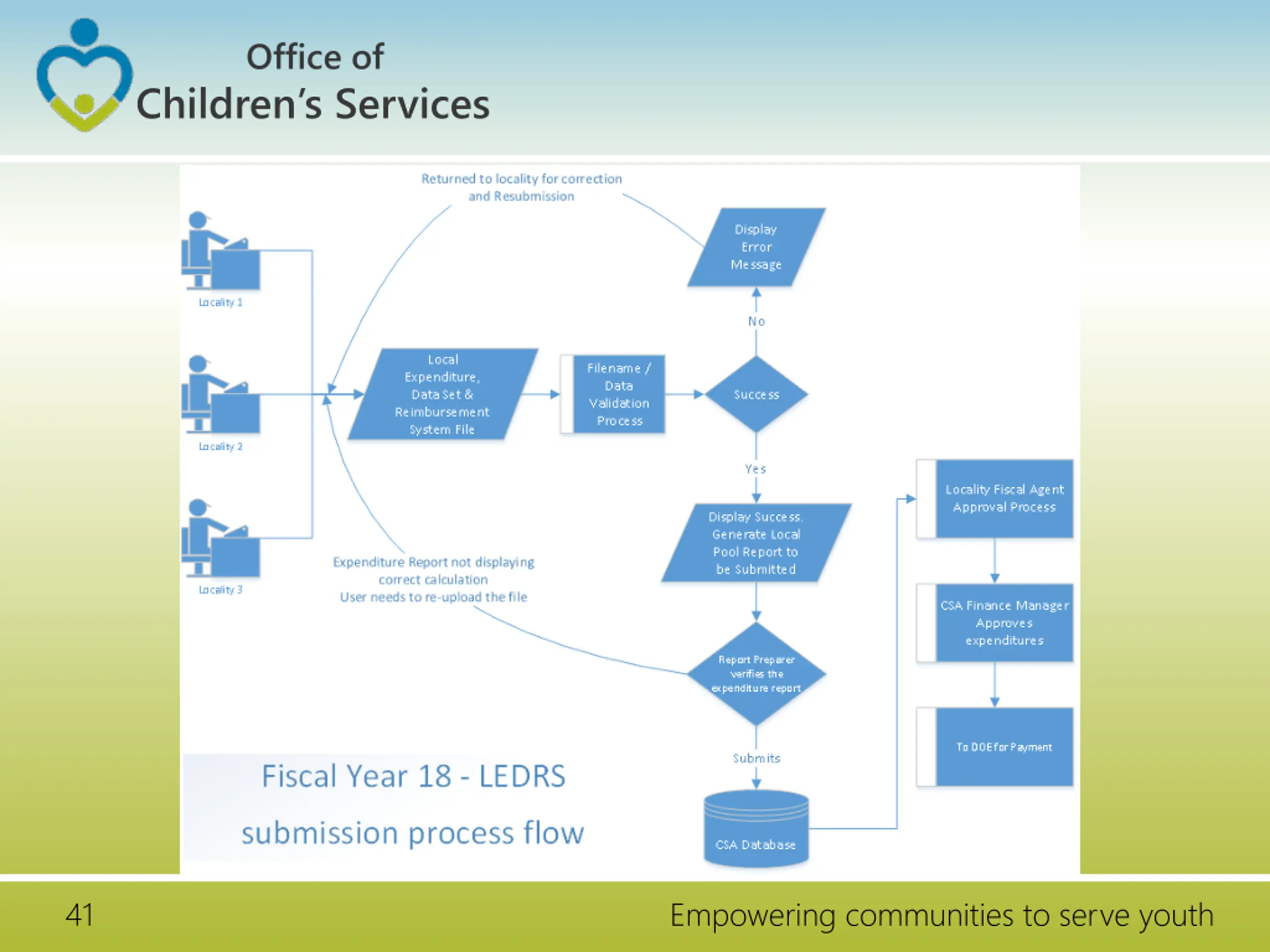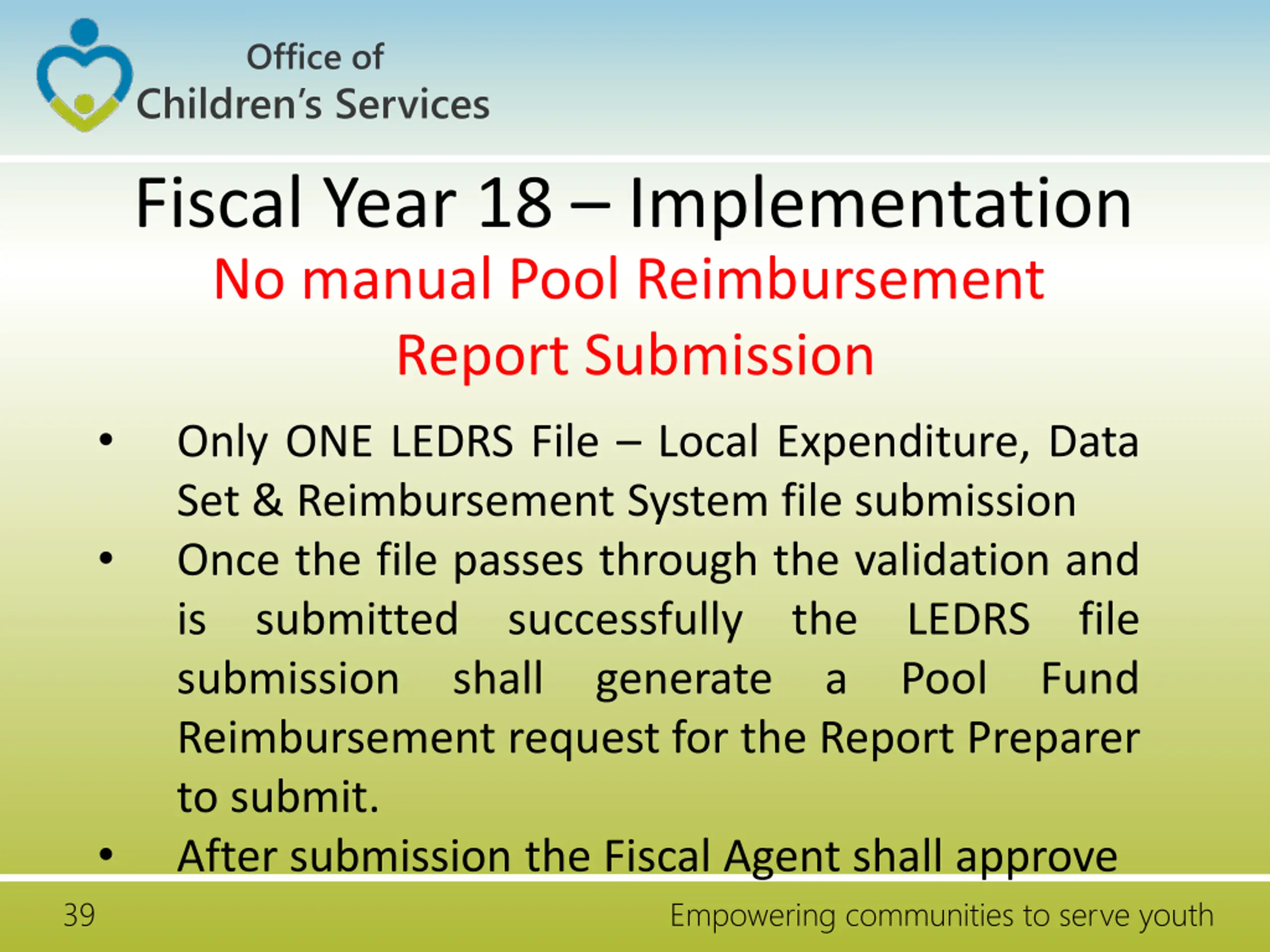 Office of Children s Services Fiscal Year 18 Implementation No manual Pool Reimbursement Report Submission Only ONE LEDRS File Local Expenditure, Data Set & Reimbursement System file submission Once the file passes through the validation and is submitted successfully the LEDRS file submission shall generate a Pool Fund Reimbursement request for the Report Preparer to submit. After submission the Fiscal Agent shall approve 39 Empowering communities to serve youth