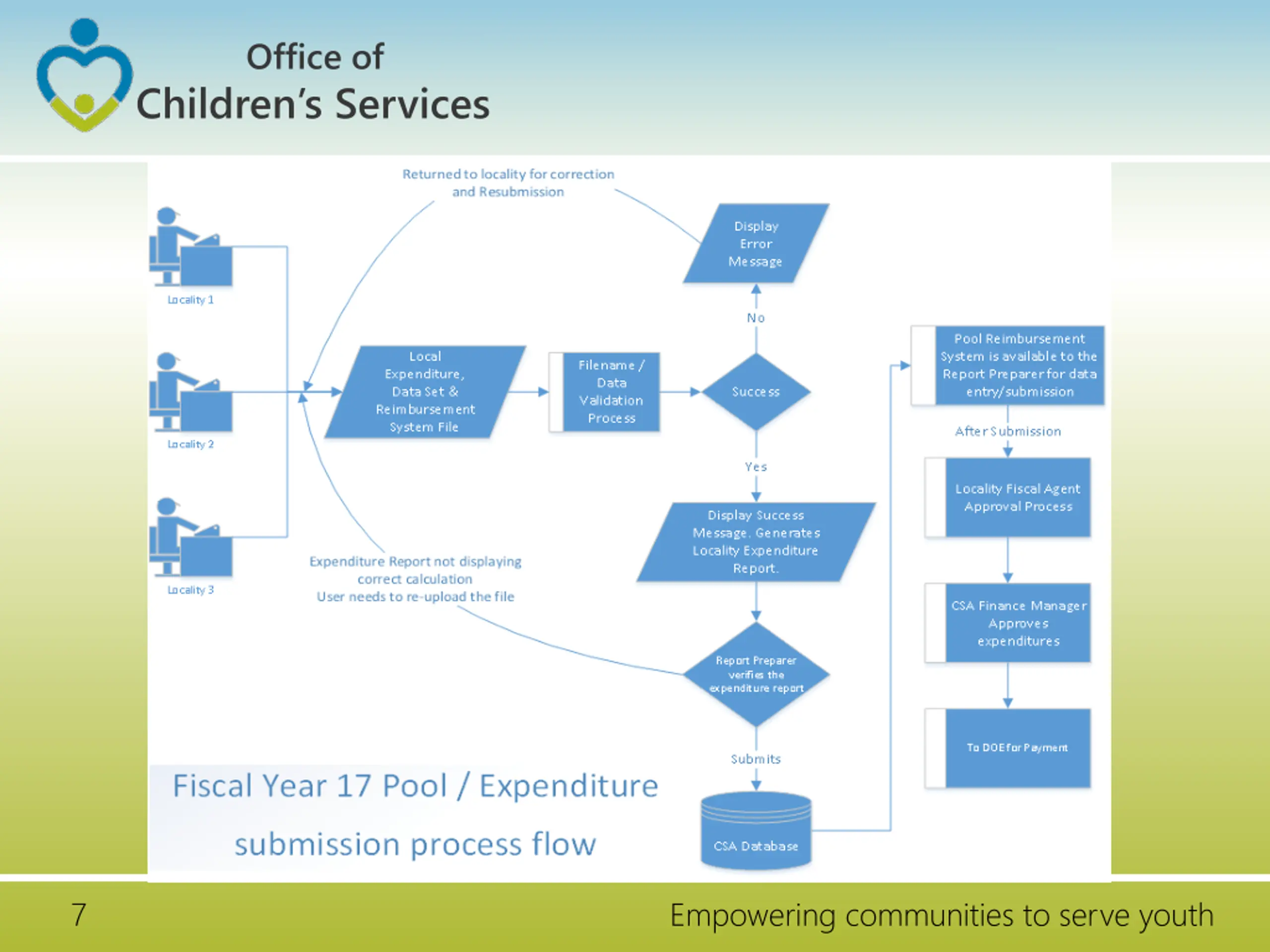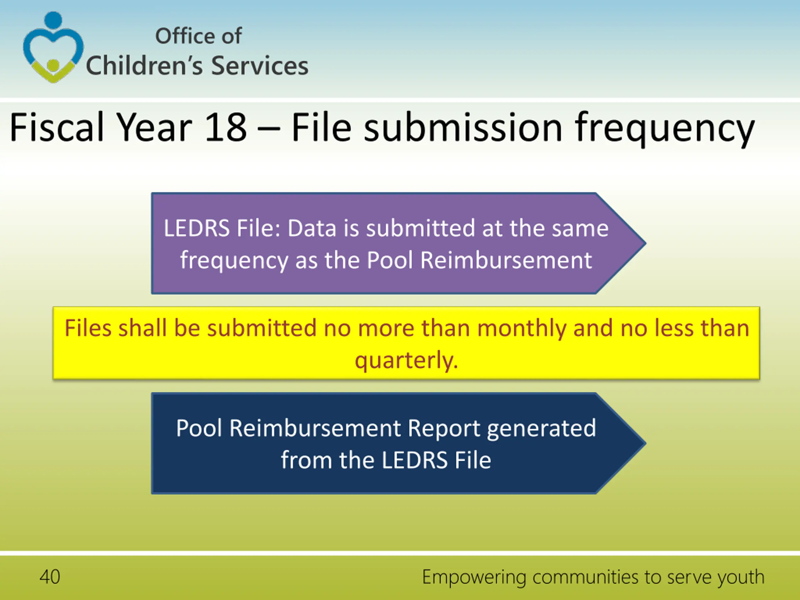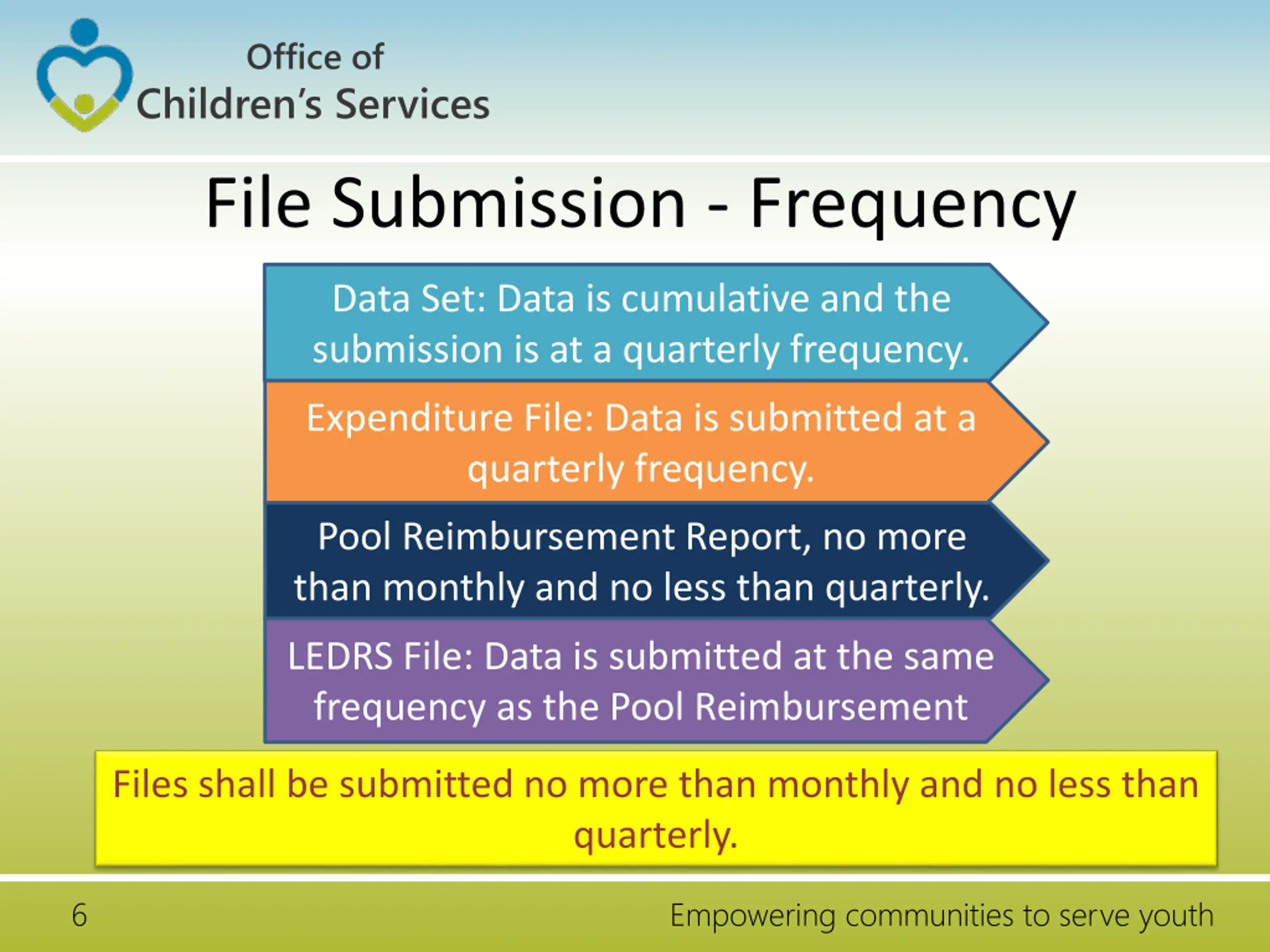 Office of Children s Services File Submission - Frequency Data Set: Data is cumulative and the submission is at a quarterly frequency. Expenditure File: Data is submitted at a quarterly frequency. Pool Reimbursement Report, no more than monthly and no less than quarterly. LEDRS File: Data is submitted at the same frequency as the Pool Reimbursement Files shall be submitted no more than monthly and no less than quarterly. 6 Empowering communities to serve youth