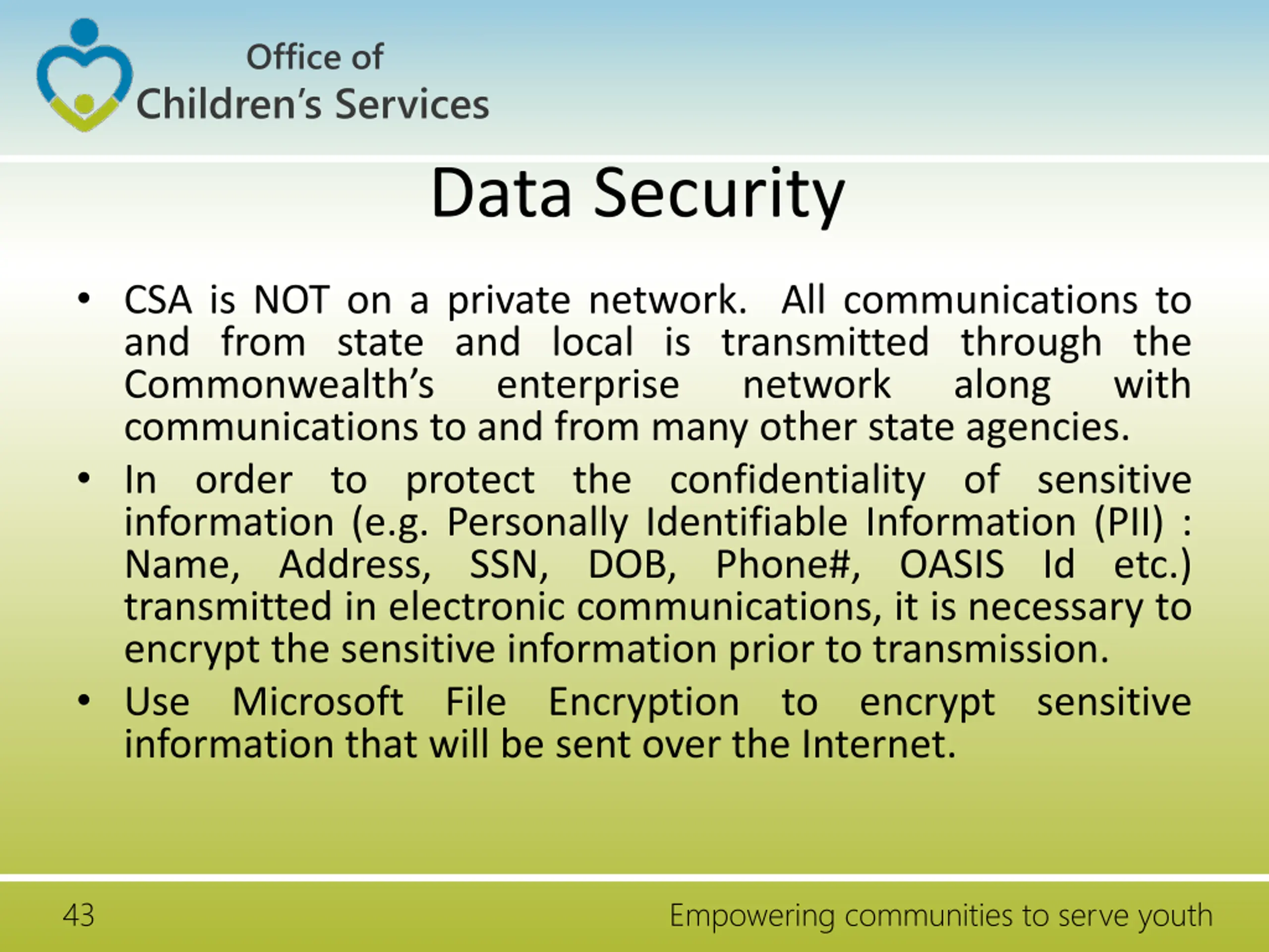 Office of Children s Services Data Security CSA is NOT on a private network. All communications to and from state and local is transmitted through the Commonwealth s enterprise communications to and from many other state agencies. In order to protect the confidentiality of sensitive information (e.g. Personally Identifiable Information (PII) : Name, Address, SSN, DOB, Phone#, OASIS Id etc.) transmitted in electronic communications, it is necessary to encrypt the sensitive information prior to transmission. Use Microsoft File Encryption to encrypt sensitive information that will be sent over the Internet. network along with 43 Empowering communities to serve youth
