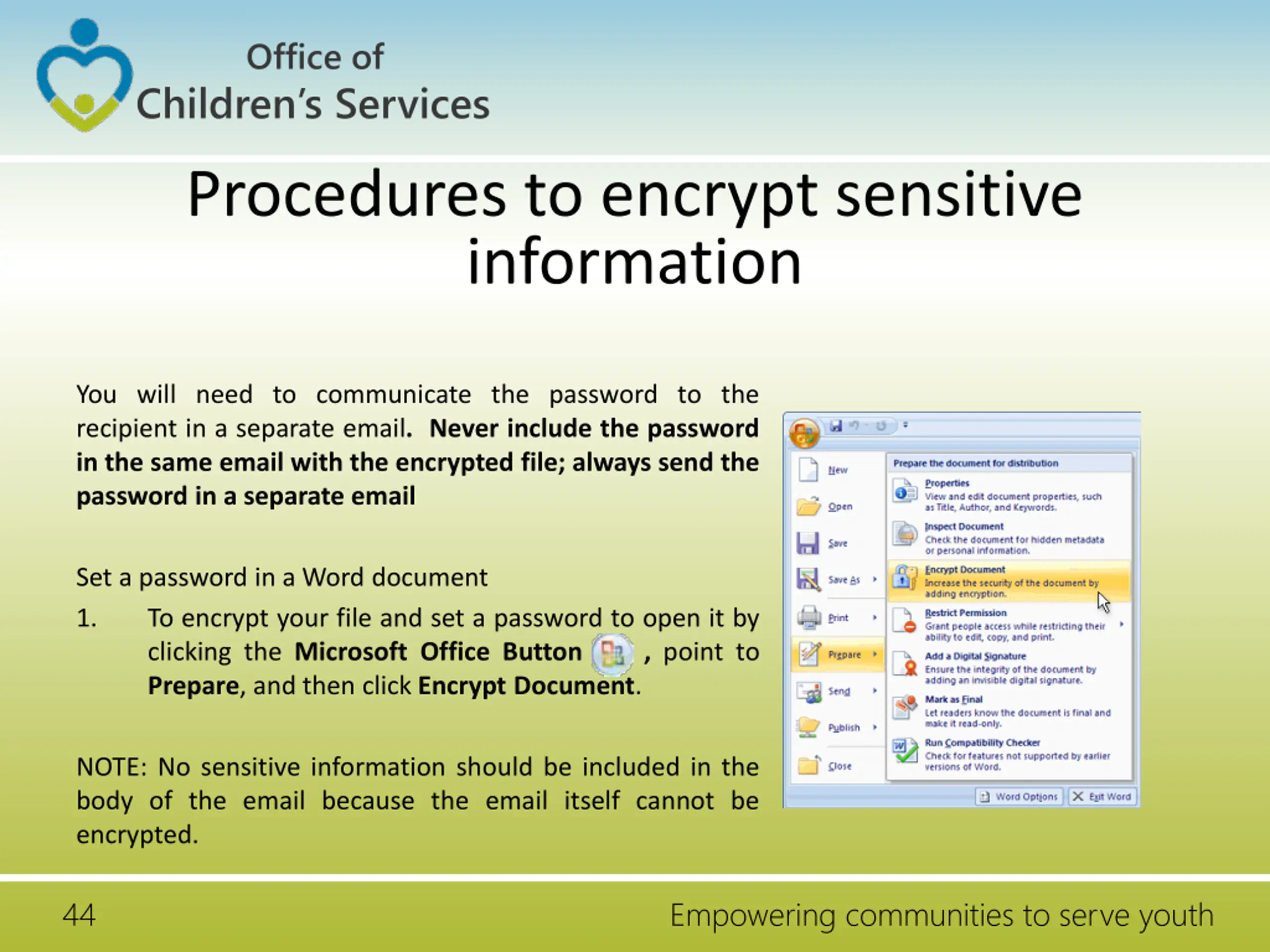 Office of Children s Services Procedures to encrypt sensitive information You will need to communicate the password to the recipient in a separate email. Never include the password in the same email with the encrypted file; always send the password in a separate email Set a password in a Word document 1. To encrypt your file and set a password to open it by clicking the Microsoft Office Button , point to Prepare, and then click Encrypt Document. NOTE: No sensitive information should be included in the body of the email because the email itself cannot be encrypted. 44 Empowering communities to serve youth
