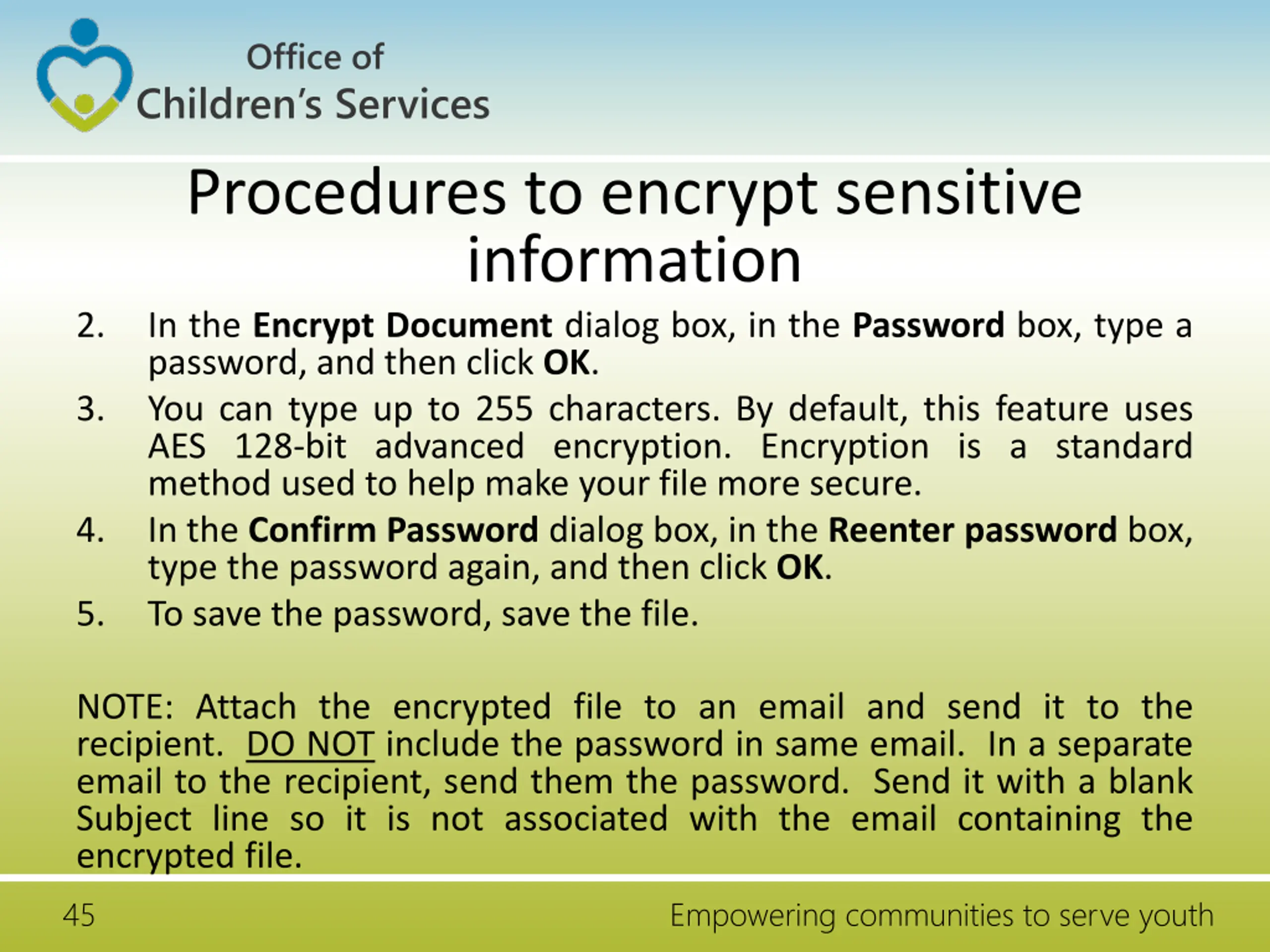 Office of Children s Services Procedures to encrypt sensitive information In the Encrypt Document dialog box, in the Password box, type a password, and then click OK. You can type up to 255 characters. By default, this feature uses AES 128-bit advanced encryption. Encryption is a standard method used to help make your file more secure. In the Confirm Password dialog box, in the Reenter password box, type the password again, and then click OK. To save the password, save the file. 2. 3. 4. 5. NOTE: Attach the encrypted file to an email and send it to the recipient. DO NOT include the password in same email. In a separate email to the recipient, send them the password. Send it with a blank Subject line so it is not associated with the email containing the encrypted file. 45 Empowering communities to serve youth