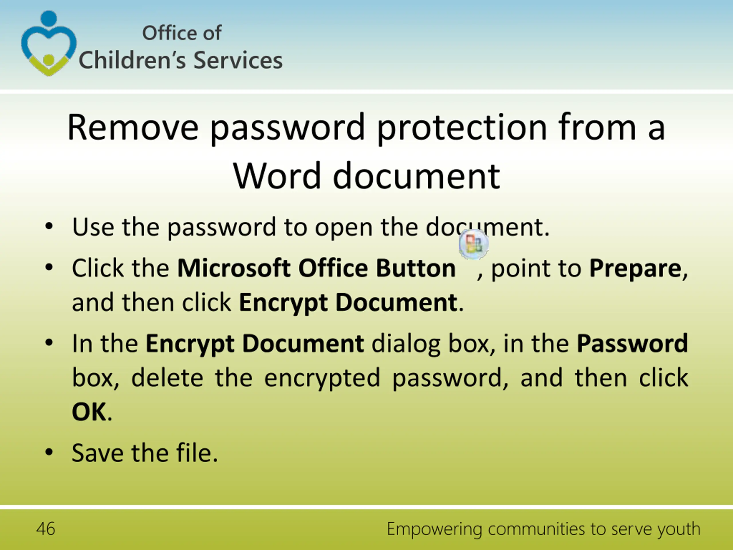 Office of Children s Services Remove password protection from a Word document Use the password to open the document. Click the Microsoft Office Button , point to Prepare, and then click Encrypt Document. In the Encrypt Document dialog box, in the Password box, delete the encrypted password, and then click OK. Save the file. 46 Empowering communities to serve youth