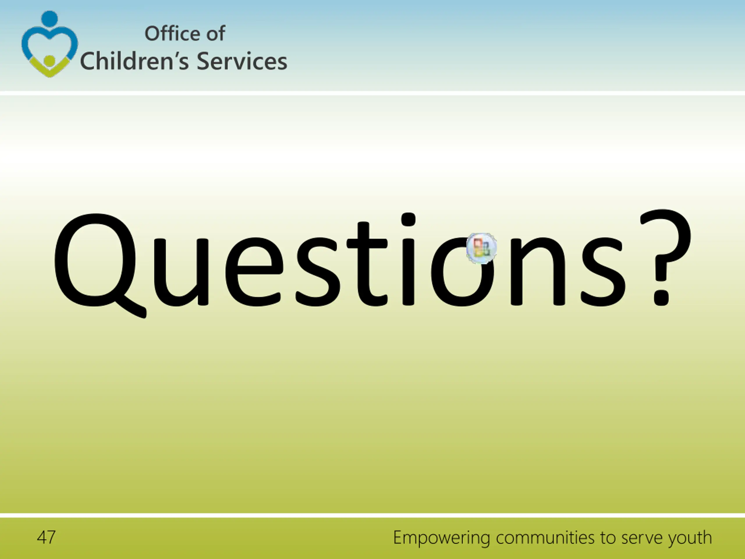 Office of Children s Services Questions? 47 Empowering communities to serve youth