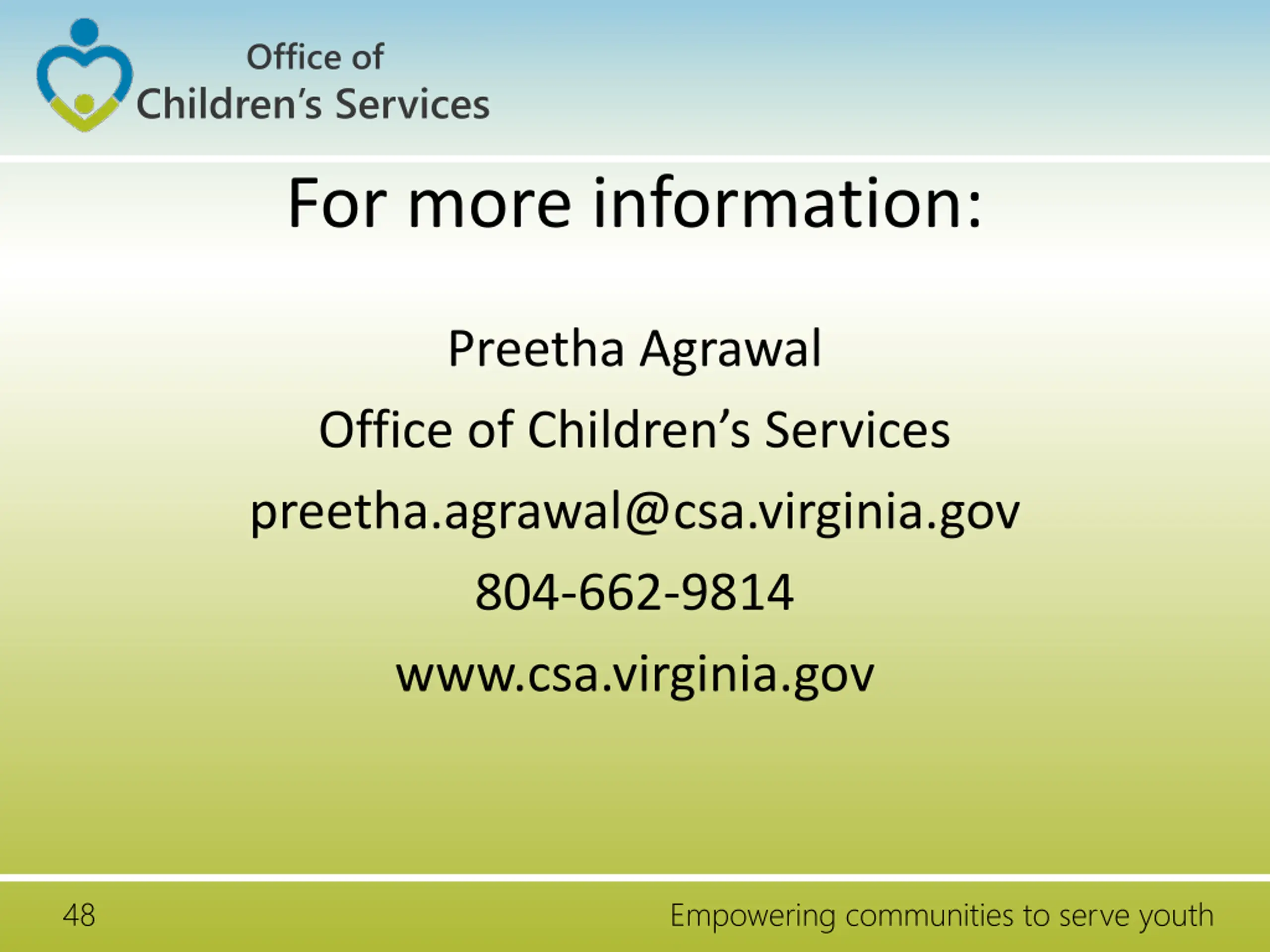 Office of Children s Services For more information: Preetha Agrawal Office of Children s Services preetha.agrawal@csa.virginia.gov 804-662-9814 www.csa.virginia.gov 48 Empowering communities to serve youth