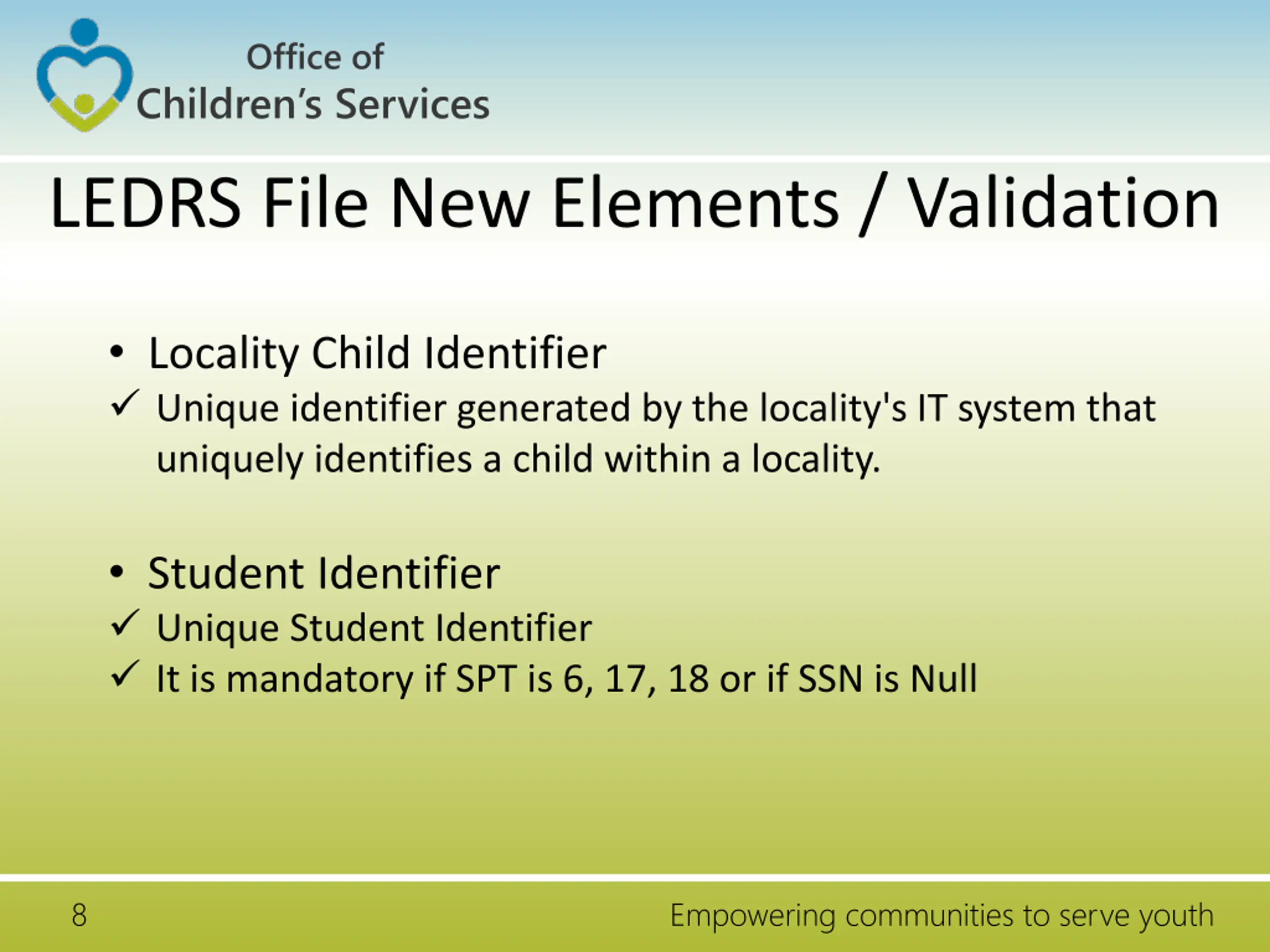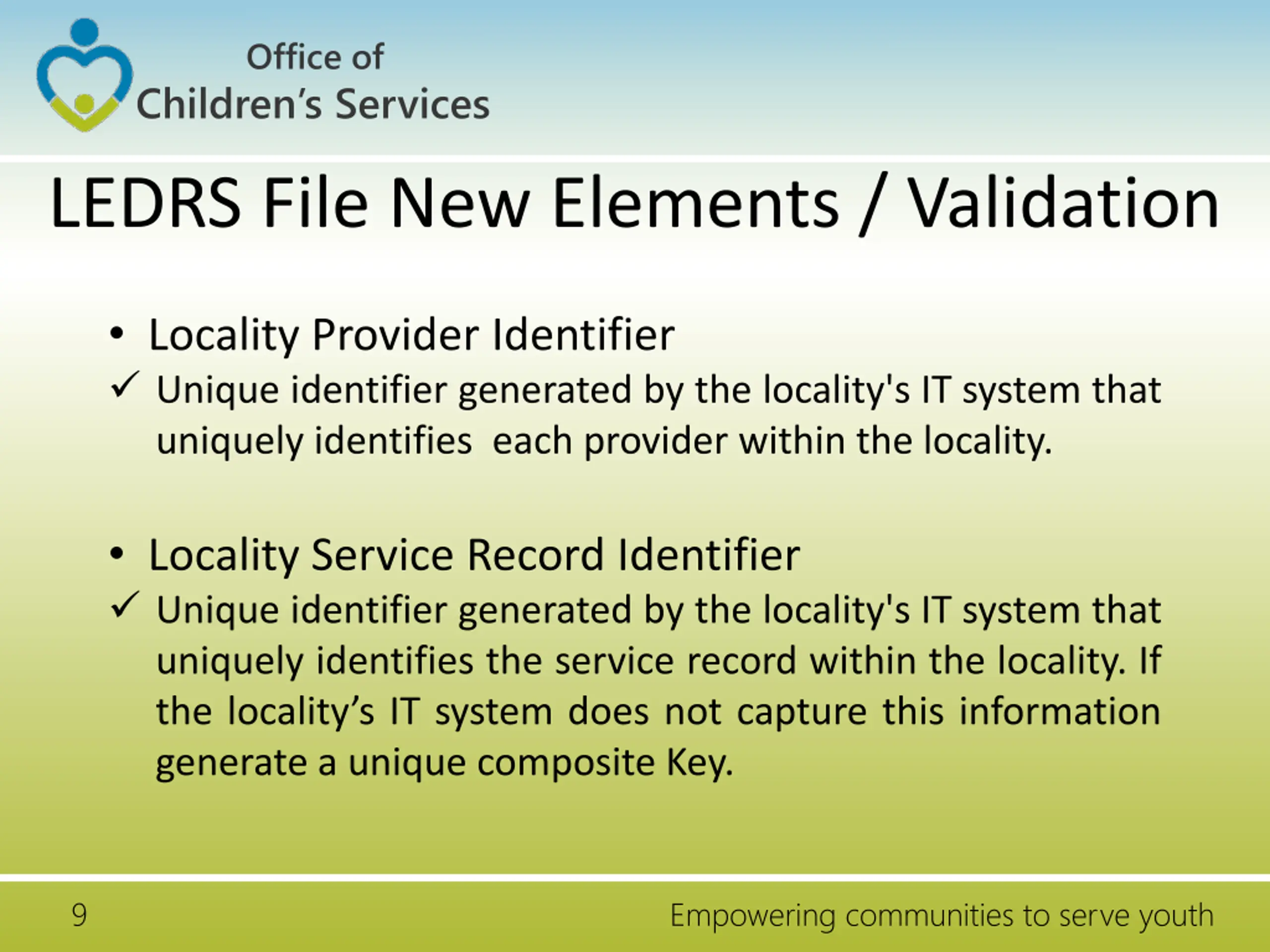 Office of Children s Services LEDRS File New Elements / Validation Locality Child Identifier Unique identifier generated by the locality's IT system that uniquely identifies a child within a locality. Student Identifier Unique Student Identifier It is mandatory if SPT is 6, 17, 18 or if SSN is Null 8 Empowering communities to serve youth