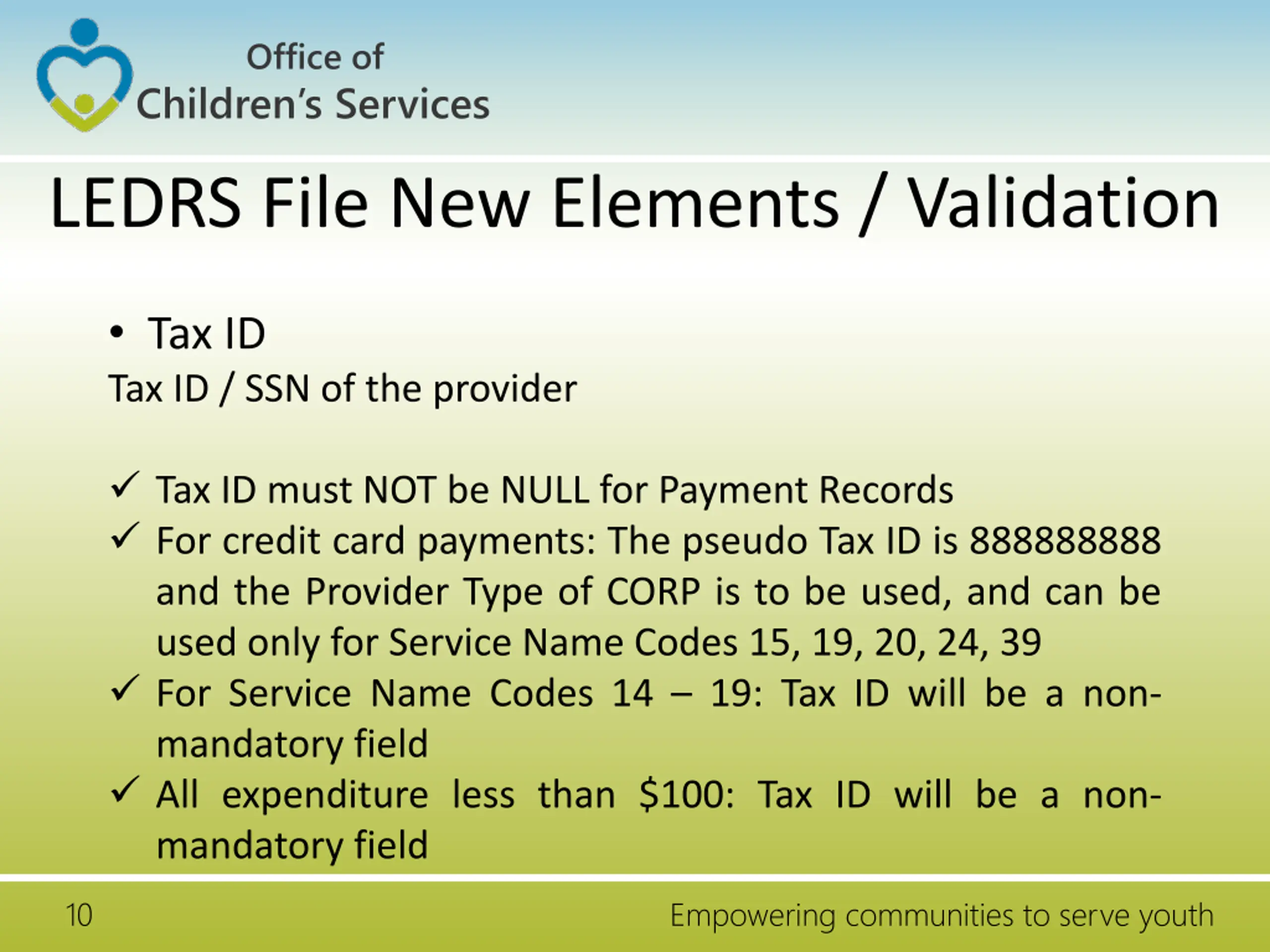 Office of Children s Services LEDRS File New Elements / Validation Tax ID Tax ID / SSN of the provider Tax ID must NOT be NULL for Payment Records For credit card payments: The pseudo Tax ID is 888888888 and the Provider Type of CORP is to be used, and can be used only for Service Name Codes 15, 19, 20, 24, 39 For Service Name Codes 14 19: Tax ID will be a non- mandatory field All expenditure less than $100: Tax ID will be a non- mandatory field 10 Empowering communities to serve youth