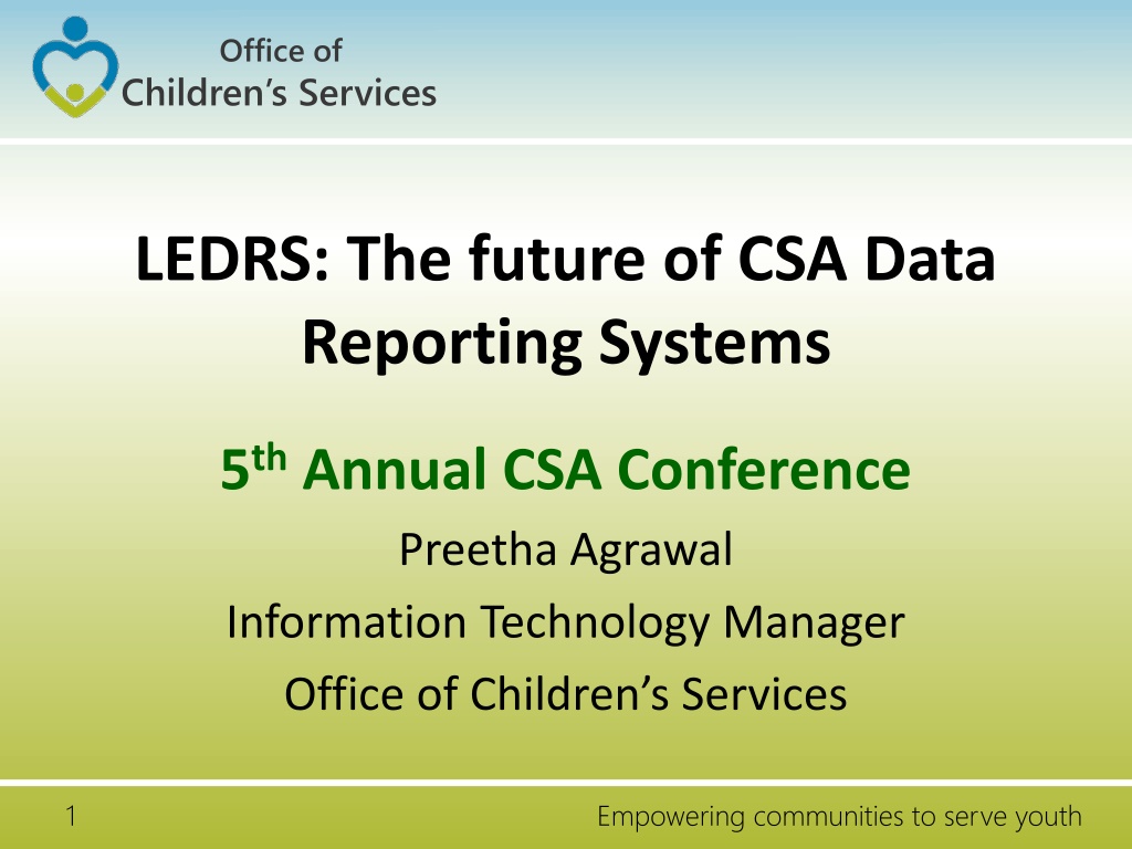 Office of Children s Services LEDRS: The future of CSA Data Reporting Systems 5th Annual CSA Conference Preetha Agrawal Information Technology Manager Office of Children s Services 1 Empowering communities to serve youth