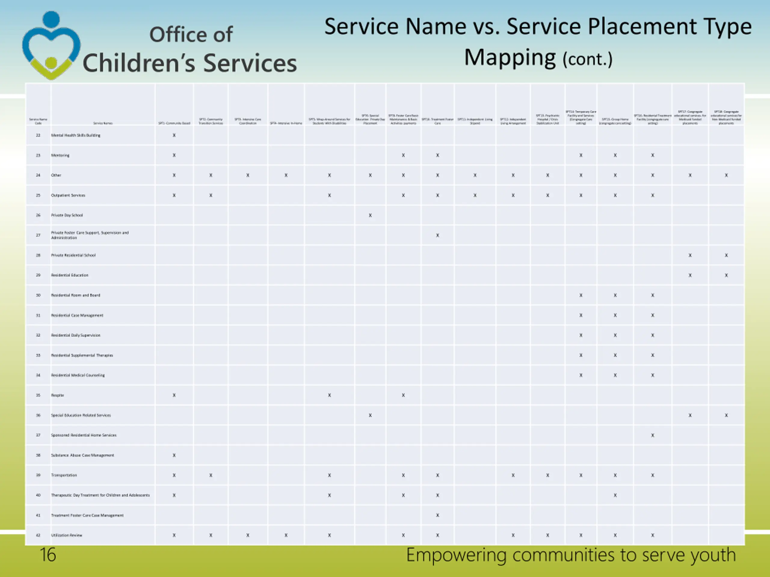 Service Name vs. Service Placement Type Mapping Office of Children s Services SPT14- Temporary Care Facility and Services (Congregate Care setting) SPT17- Congregate educational services- for Medicaid funded placements SPT18- Congregate educational services for Non-Medicaid funded placements SPT8- Foster Care Basic Maintenance & Basic Activities payments SPT13- Psychiatric Hospital / Crisis Stabilization Unit SPT16- Residental Treatment Facility (congregate care setting) SPT2- Community Transition Services SPT3- Intensive Care Coordination SPT5- Wrap-Around Services for Students With Disabilities SPT6- Special Education Private Day Placement SPT10- Treatment Foster Care SPT11- Independent Living Stipend SPT12- Independent Living Arrangement SPT15- Group Home (congregate care setting) Service Name Code Service Names SPT1- Community Based SPT4- Intensive In-Home X 1 Acute Psychiatric Hospitalization X X X X X X X 2 Applied Behavior Analysis X X X X X X X X X 3 Assessment/Evaluation X X X X X X X 4 Case Support X X X X X X X 5 Crisis Intervention X X X X X X X X X 6 Crisis Stabilization X X X X X X X X X X X 7 Family Partnership Facilitation X X 8 Family Support Services X X X X X X X X 9 Independent Living Services X X X X X X X X X X X X 10 Individualized Support Services X 11 Intensive Care Coordination X 12 Intensive Care Coordination Family Support Partner X 13 Intensive In-Home Services X X 14 Maintenance Basic X 15 Maintenance Clothing Supplement X X 16 Maintenance-Child Care Assistance X X 17 Maintenance - Enhanced X X 18 Independent Living X X X X 19 Maintenance Transportation X X 20 Material Support X 21 Mental Health Case Management 15 Empowering communities to serve youth