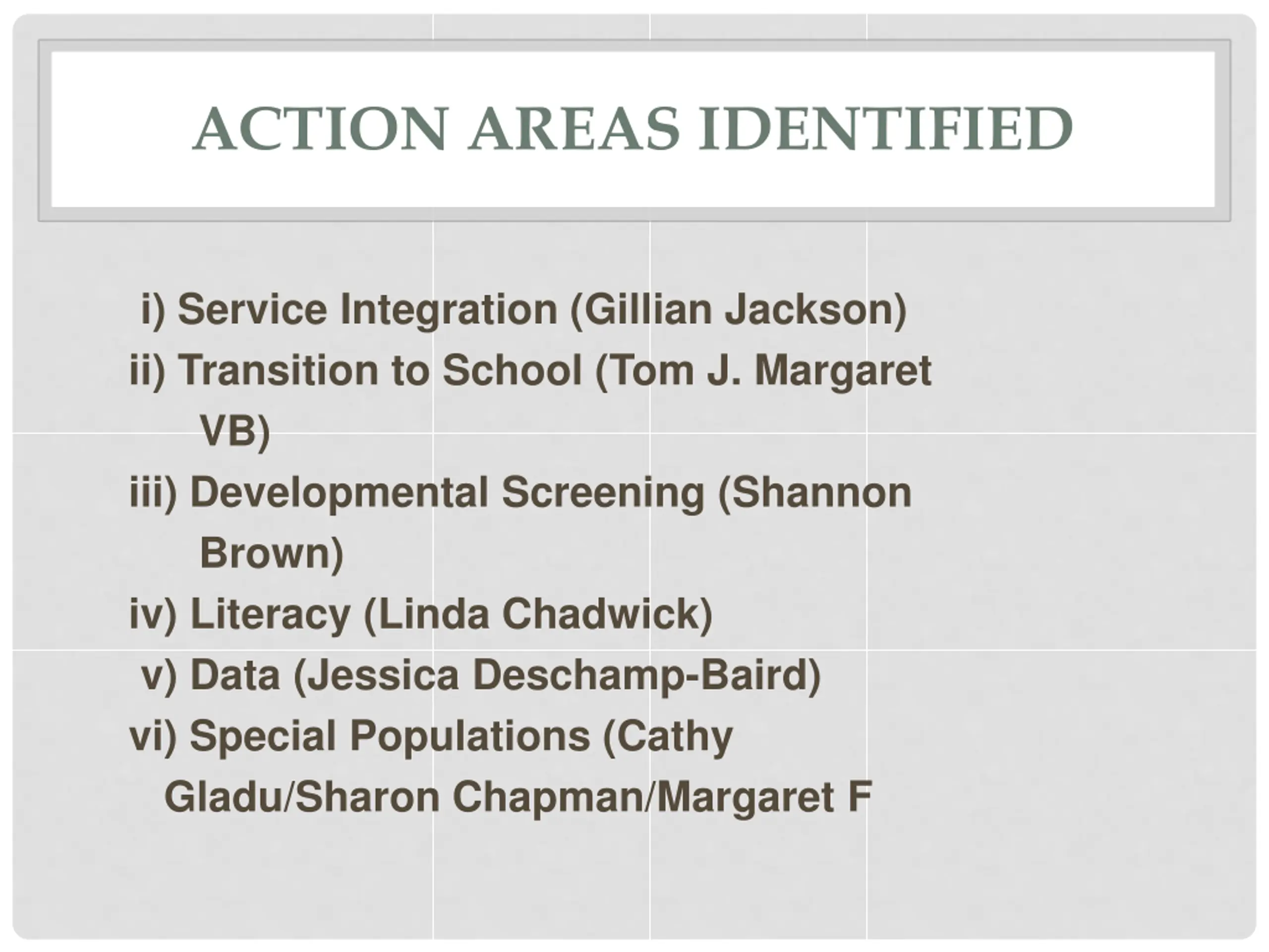 ACTION AREAS IDENTIFIED i) Service Integration (Gillian Jackson) ii) Transition to School (Tom J. Margaret VB) iii) Developmental Screening (Shannon Brown) iv) Literacy (Linda Chadwick) v) Data (Jessica Deschamp-Baird) vi) Special Populations (Cathy Gladu/Sharon Chapman/Margaret F
