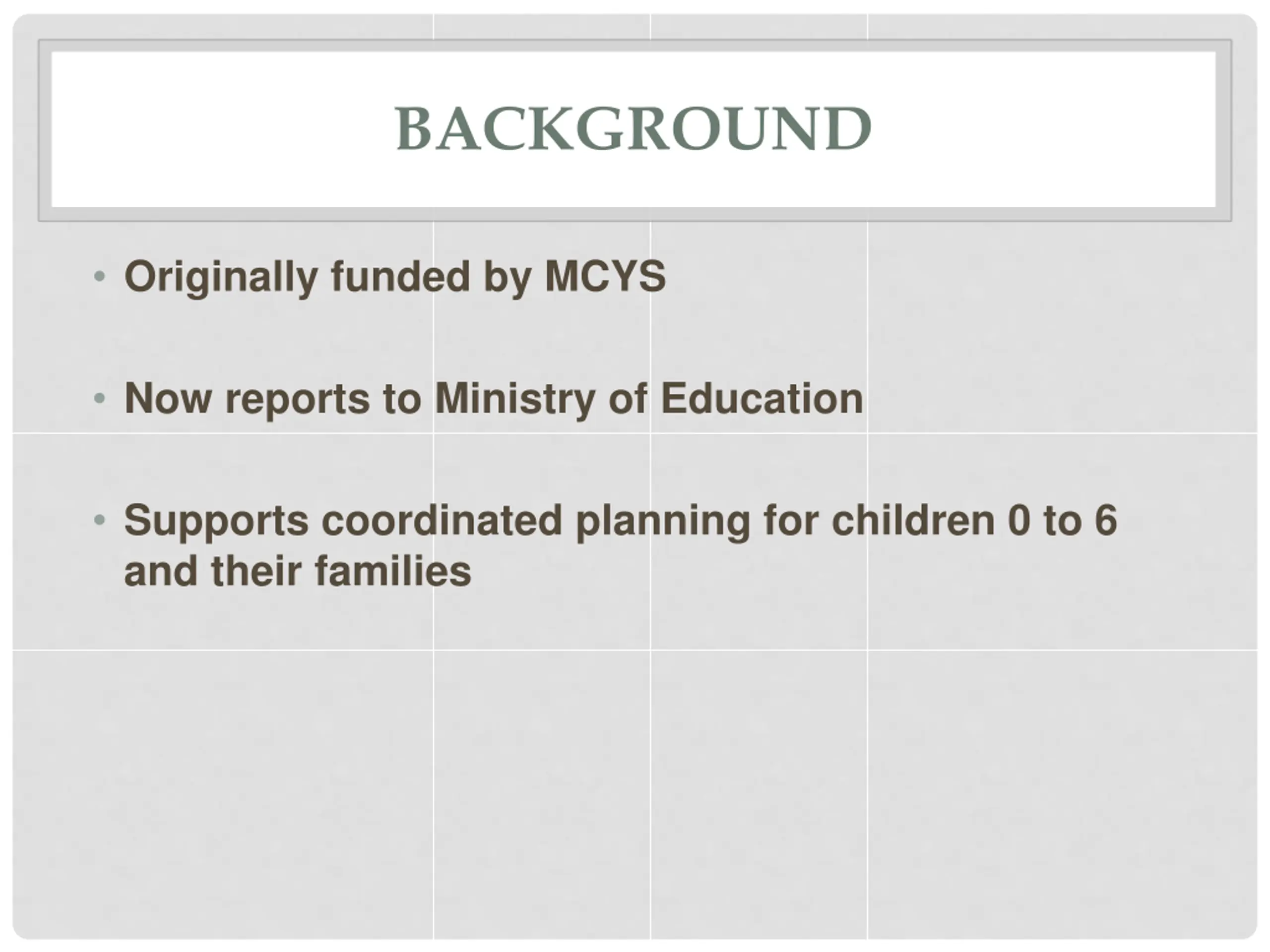 BACKGROUND Originally funded by MCYS Now reports to Ministry of Education Supports coordinated planning for children 0 to 6 and their families