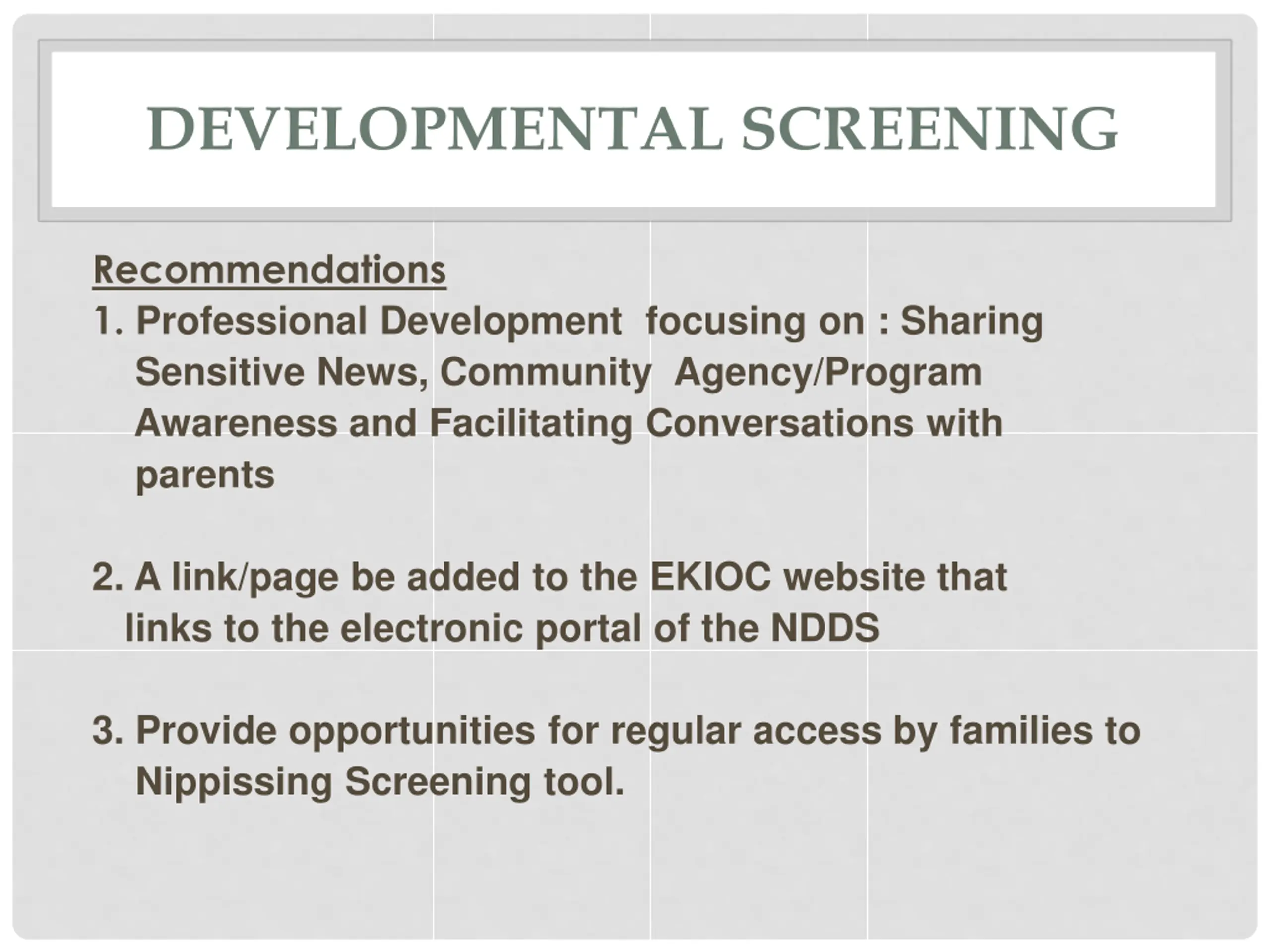DEVELOPMENTAL SCREENING Recommendations 1. Professional Development focusing on : Sharing Sensitive News, Community Agency/Program Awareness and Facilitating Conversations with parents 2. A link/page be added to the EKIOC website that links to the electronic portal of the NDDS 3. Provide opportunities for regular access by families to Nippissing Screening tool.