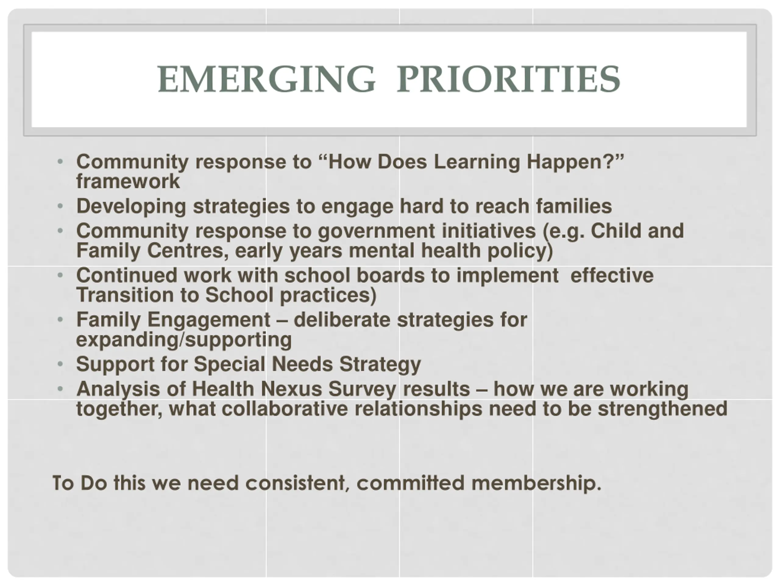 EMERGING PRIORITIES Community response to How Does Learning Happen? framework Developing strategies to engage hard to reach families Community response to government initiatives (e.g. Child and Family Centres, early years mental health policy) Continued work with school boards to implement effective Transition to School practices) Family Engagement deliberate strategies for expanding/supporting Support for Special Needs Strategy Analysis of Health Nexus Survey results how we are working together, what collaborative relationships need to be strengthened To Do this we need consistent, committed membership.