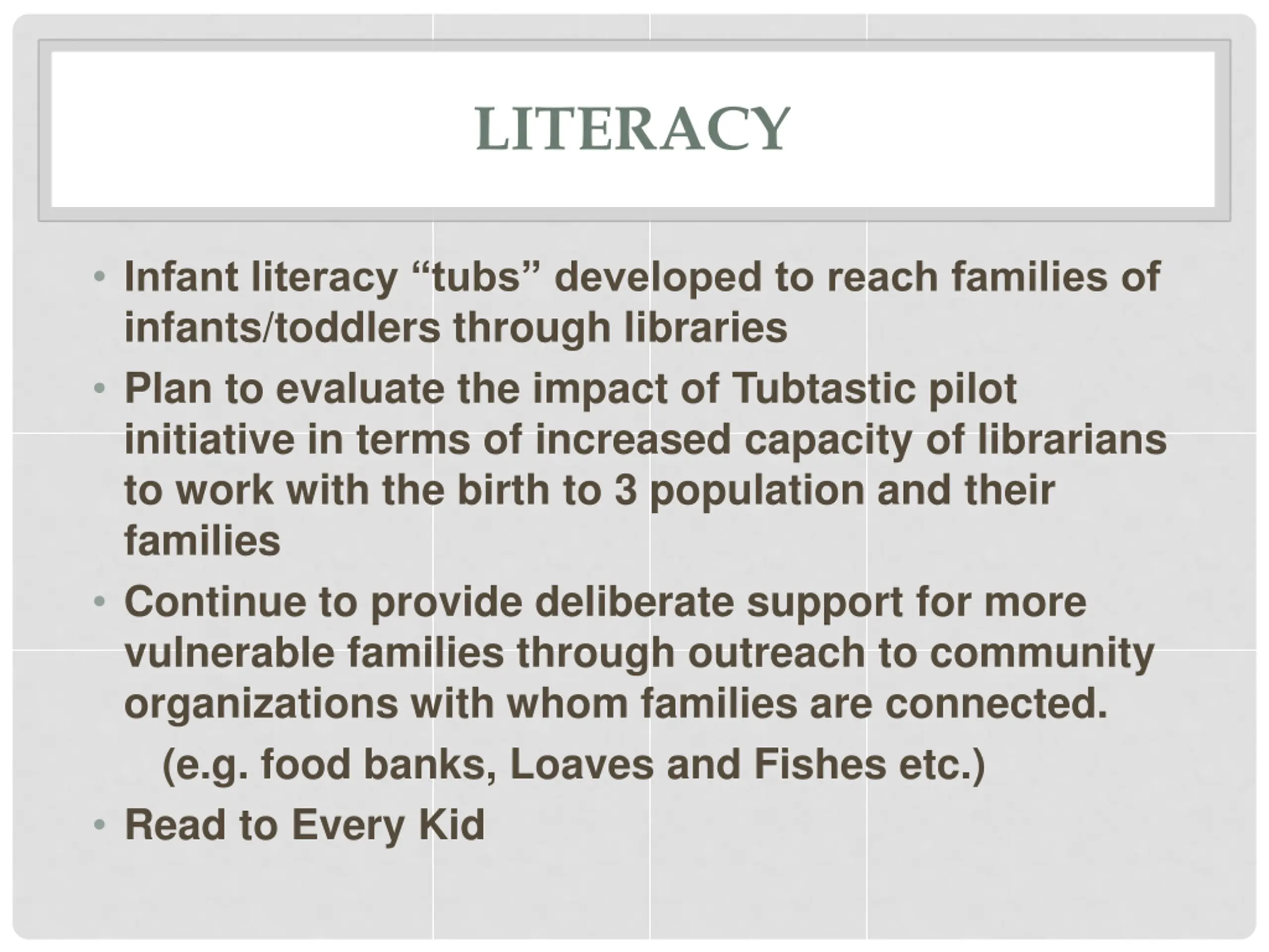 LITERACY Infant literacy tubs developed to reach families of infants/toddlers through libraries Plan to evaluate the impact of Tubtastic pilot initiative in terms of increased capacity of librarians to work with the birth to 3 population and their families Continue to provide deliberate support for more vulnerable families through outreach to community organizations with whom families are connected. (e.g. food banks, Loaves and Fishes etc.) Read to Every Kid