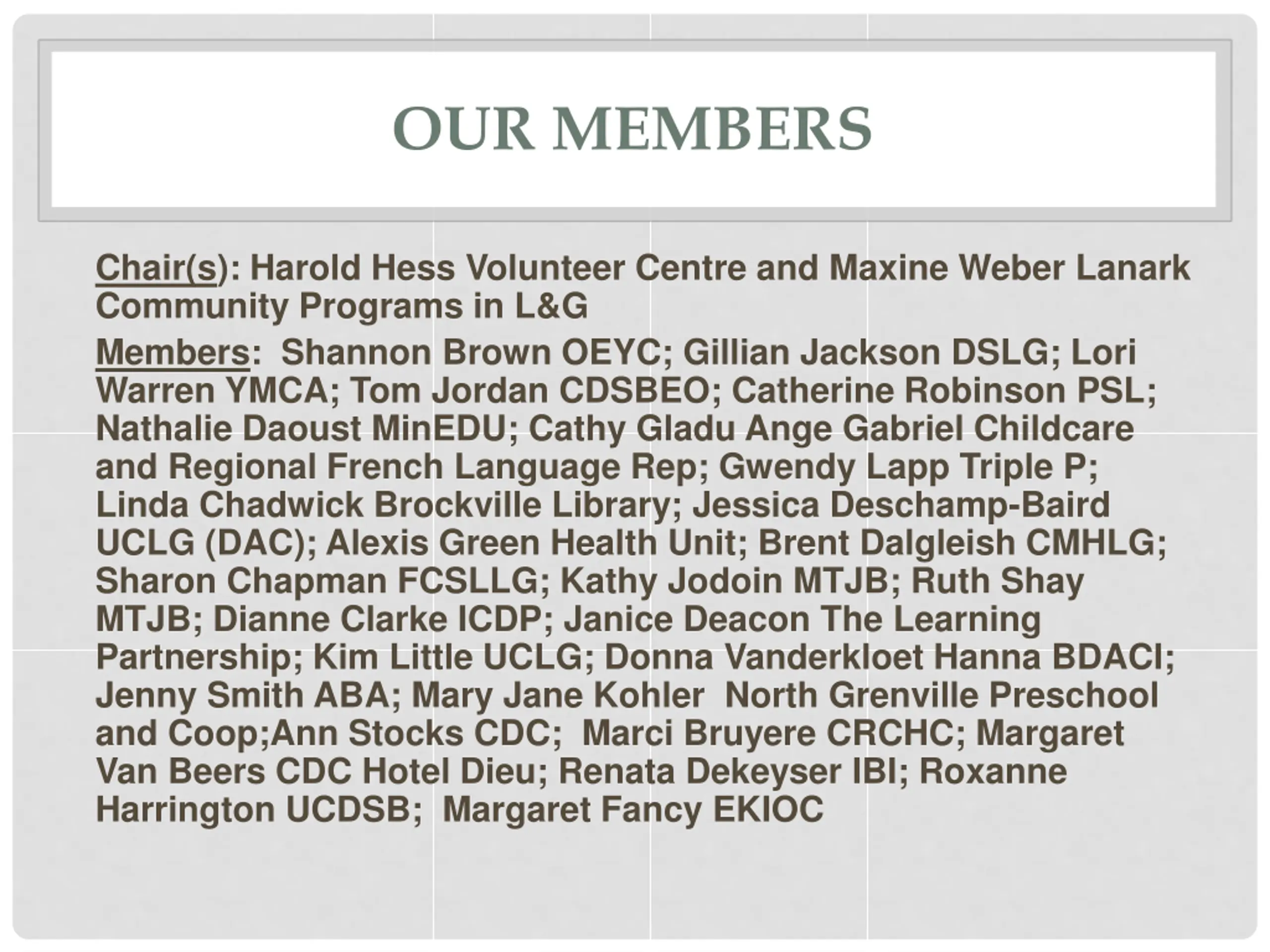 OUR MEMBERS Chair(s): Harold Hess Volunteer Centre and Maxine Weber Lanark Community Programs in L&G Members: Shannon Brown OEYC; Gillian Jackson DSLG; Lori Warren YMCA; Tom Jordan CDSBEO; Catherine Robinson PSL; Nathalie Daoust MinEDU; Cathy Gladu Ange Gabriel Childcare and Regional French Language Rep; Gwendy Lapp Triple P; Linda Chadwick Brockville Library; Jessica Deschamp-Baird UCLG (DAC); Alexis Green Health Unit; Brent Dalgleish CMHLG; Sharon Chapman FCSLLG; Kathy Jodoin MTJB; Ruth Shay MTJB; Dianne Clarke ICDP; Janice Deacon The Learning Partnership; Kim Little UCLG; Donna Vanderkloet Hanna BDACI; Jenny Smith ABA; Mary Jane Kohler North Grenville Preschool and Coop;Ann Stocks CDC; Marci Bruyere CRCHC; Margaret Van Beers CDC Hotel Dieu; Renata Dekeyser IBI; Roxanne Harrington UCDSB; Margaret Fancy EKIOC