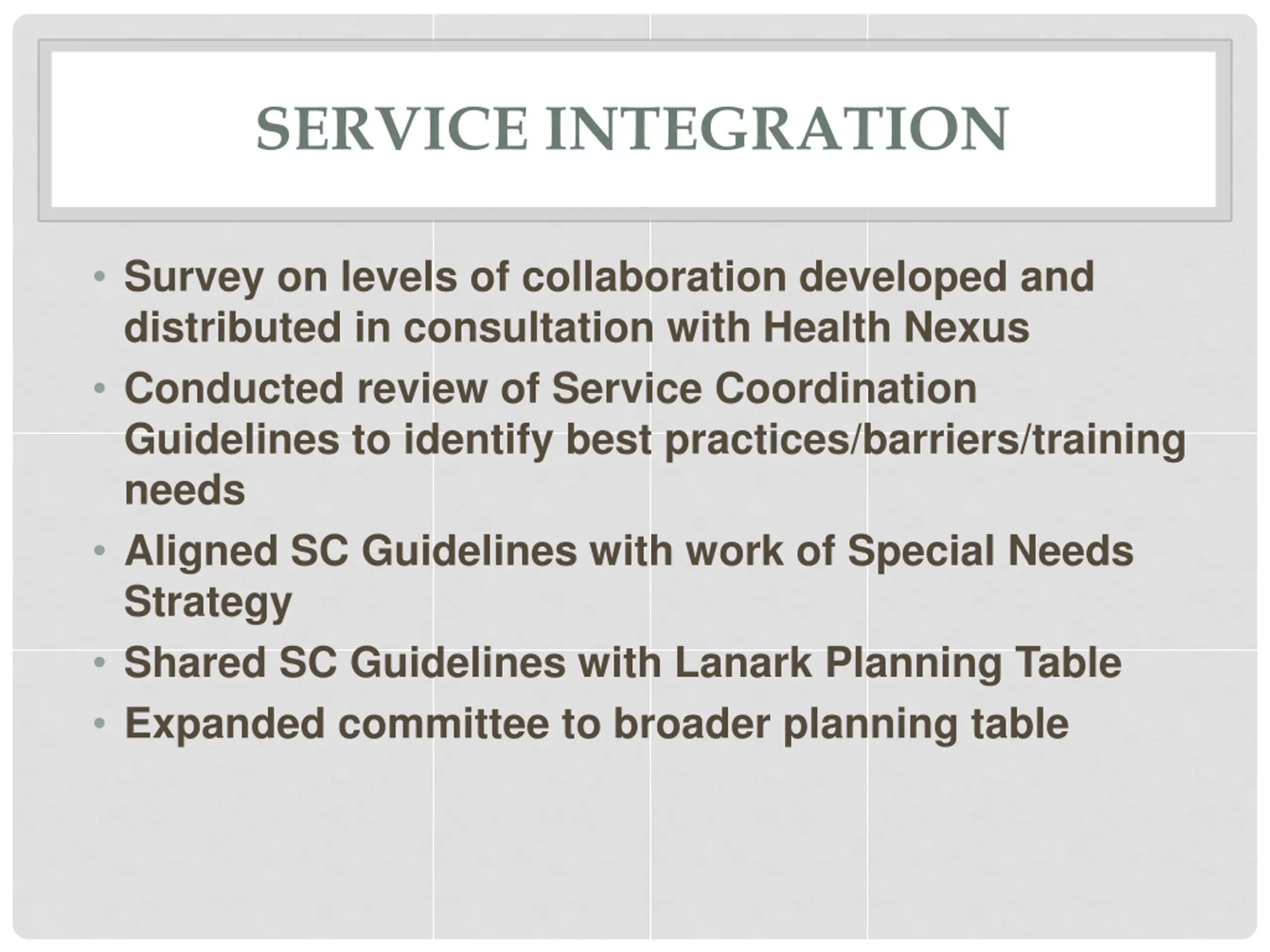 SERVICE INTEGRATION Survey on levels of collaboration developed and distributed in consultation with Health Nexus Conducted review of Service Coordination Guidelines to identify best practices/barriers/training needs Aligned SC Guidelines with work of Special Needs Strategy Shared SC Guidelines with Lanark Planning Table Expanded committee to broader planning table