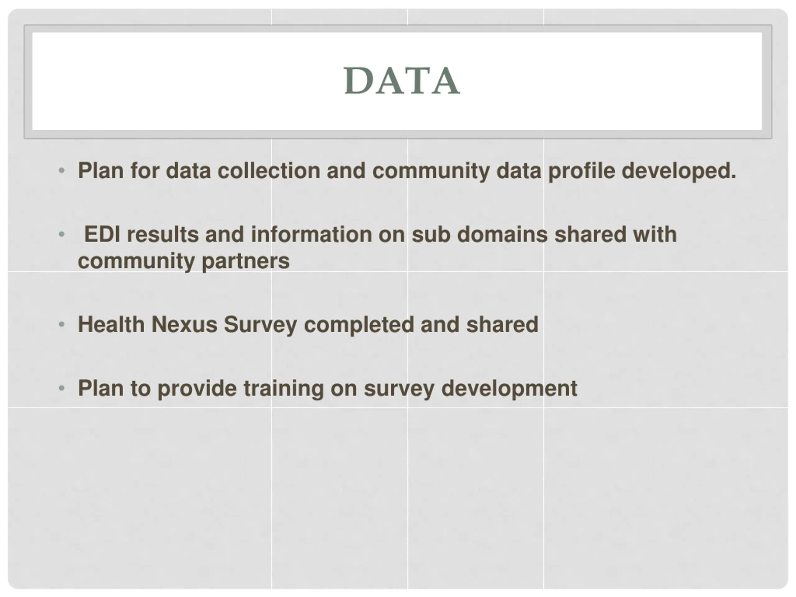 DATA Plan for data collection and community data profile developed. EDI results and information on sub domains shared with community partners Health Nexus Survey completed and shared Plan to provide training on survey development