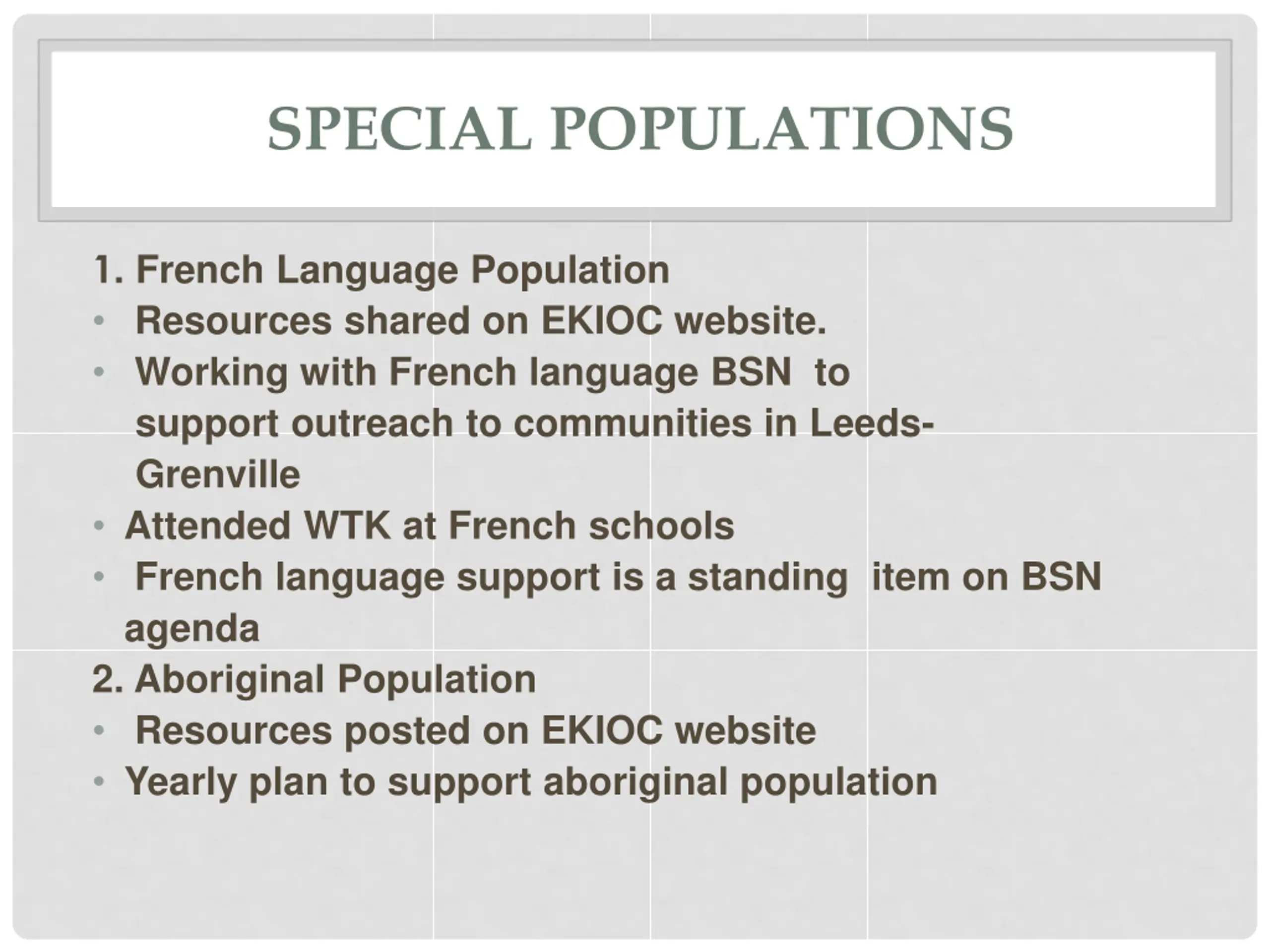 SPECIAL POPULATIONS 1. French Language Population Resources shared on EKIOC website. Working with French language BSN to support outreach to communities in Leeds- Grenville Attended WTK at French schools French language support is a standing item on BSN agenda 2. Aboriginal Population Resources posted on EKIOC website Yearly plan to support aboriginal population