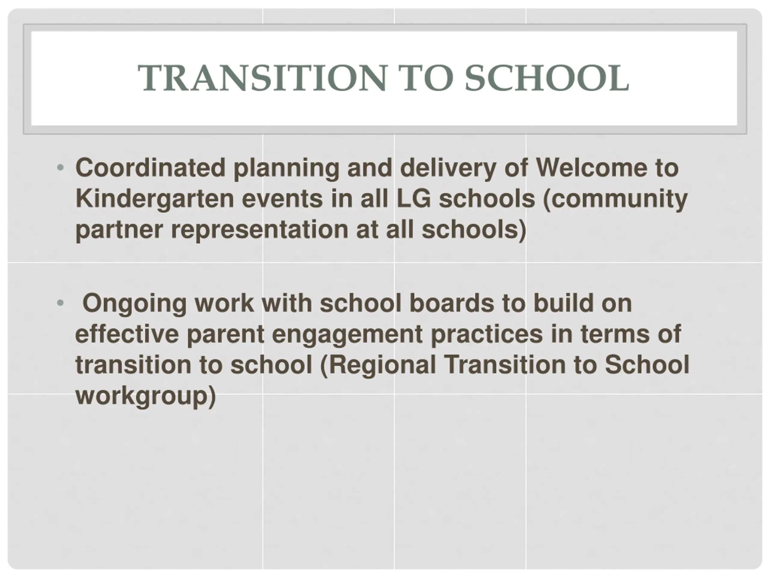 TRANSITION TO SCHOOL Coordinated planning and delivery of Welcome to Kindergarten events in all LG schools (community partner representation at all schools) Ongoing work with school boards to build on effective parent engagement practices in terms of transition to school (Regional Transition to School workgroup)