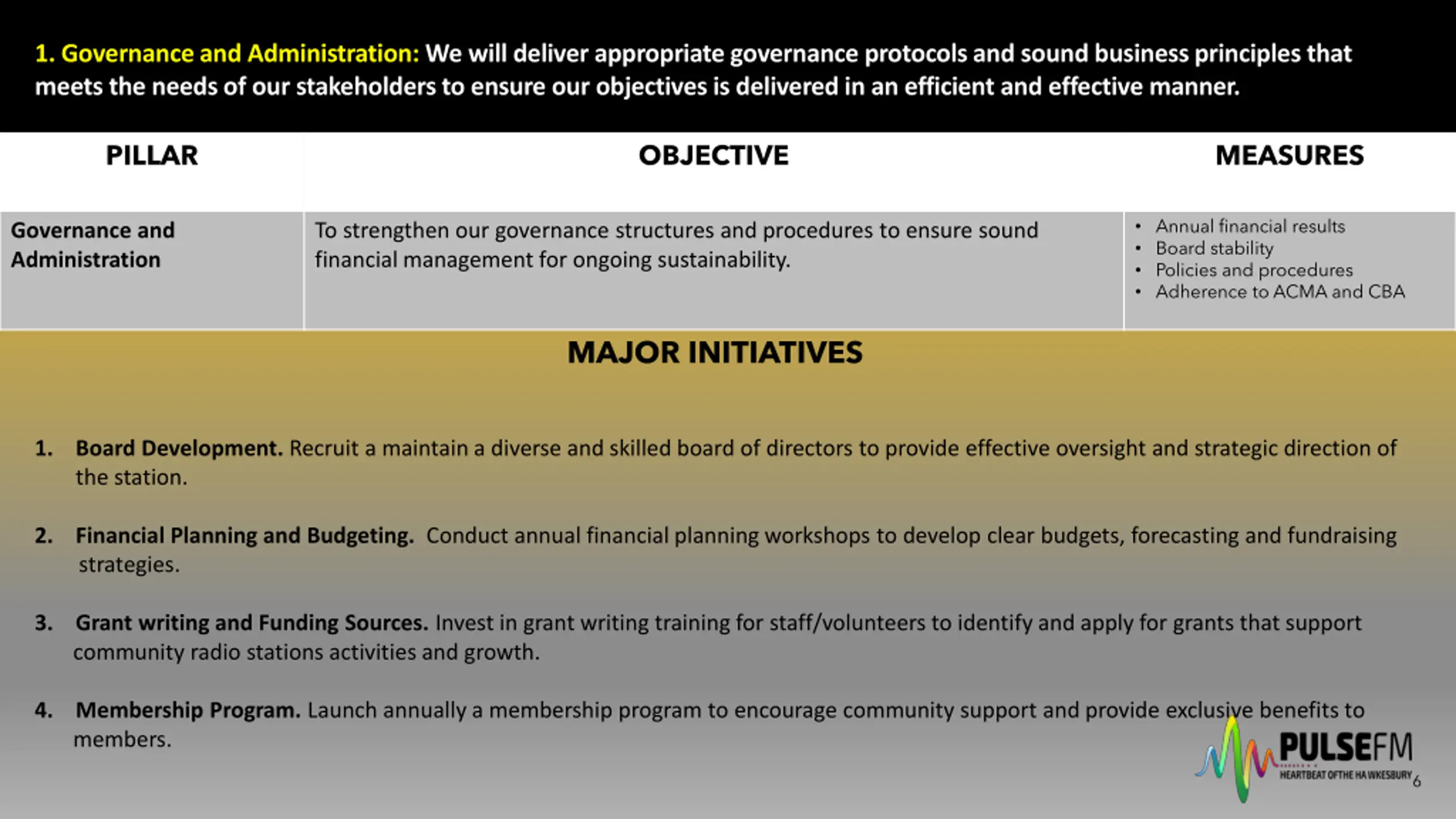 1. Governance and Administration: We will deliver appropriate governance protocols and sound business principles that meets the needs of our stakeholders to ensure our objectives is delivered in an efficient and effective manner. PILLAR OBJECTIVE MEASURES Annual financial results Board stability Policies and procedures Adherence to ACMA and CBA Governance and Administration To strengthen our governance structures and procedures to ensure sound financial management for ongoing sustainability. MAJOR INITIATIVES 1. Board Development. Recruit a maintain a diverse and skilled board of directors to provide effective oversight and strategic direction of the station. 2. strategies. Financial Planning and Budgeting. Conduct annual financial planning workshops to develop clear budgets, forecasting and fundraising 3. community radio stations activities and growth. Grant writing and Funding Sources. Invest in grant writing training for staff/volunteers to identify and apply for grants that support 4. members. Membership Program. Launch annually a membership program to encourage community support and provide exclusive benefits to 6