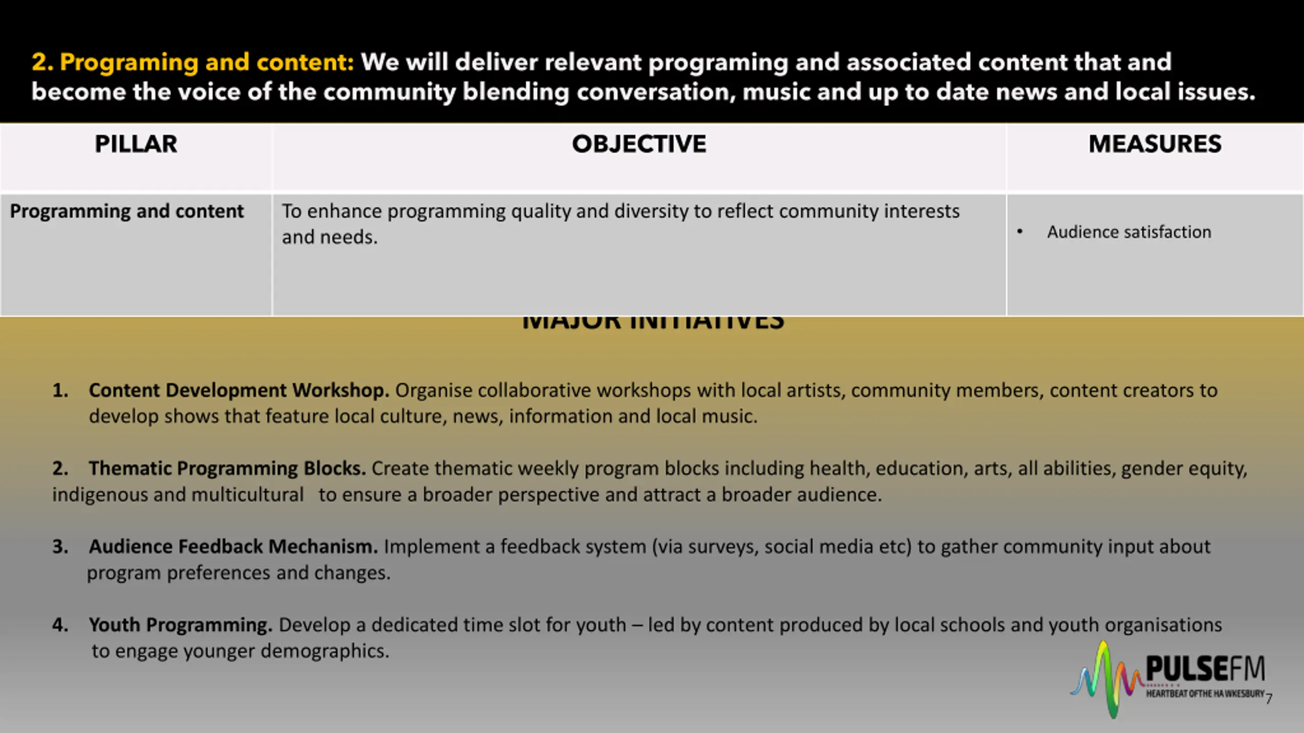2. Programing and content: We will deliver relevant programing and associated content that and become the voice of the community blending conversation, music and up to date news and local issues. PILLAR OBJECTIVE MEASURES Programming and content To enhance programming quality and diversity to reflect community interests and needs. Audience satisfaction MAJOR INITIATIVES 1. Content Development Workshop. Organise collaborative workshops with local artists, community members, content creators to develop shows that feature local culture, news, information and local music. 2. Thematic Programming Blocks. Create thematic weekly program blocks including health, education, arts, all abilities, gender equity, indigenous and multicultural to ensure a broader perspective and attract a broader audience. 3. program preferences and changes. Audience Feedback Mechanism. Implement a feedback system (via surveys, social media etc) to gather community input about 4. to engage younger demographics. Youth Programming. Develop a dedicated time slot for youth led by content produced by local schools and youth organisations 7