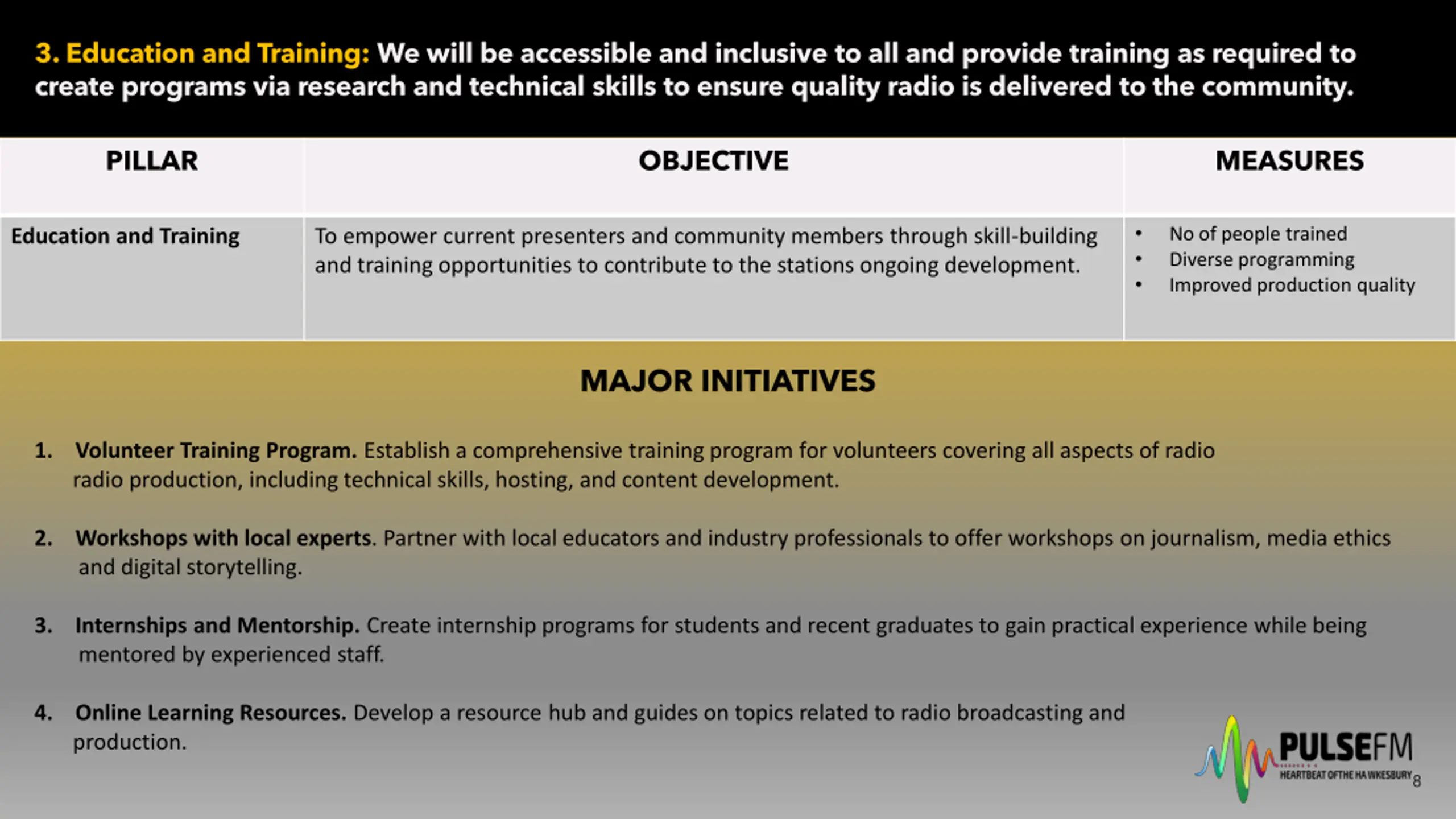 3. Education and Training: We will be accessible and inclusive to all and provide training as required to create programs via research and technical skills to ensure quality radio is delivered to the community. PILLAR OBJECTIVE MEASURES No of people trained Diverse programming Improved production quality Education and Training To empower current presenters and community members through skill-building and training opportunities to contribute to the stations ongoing development. MAJOR INITIATIVES 1. radio production, including technical skills, hosting, and content development. Volunteer Training Program. Establish a comprehensive training program for volunteers covering all aspects of radio 2. and digital storytelling. Workshops with local experts. Partner with local educators and industry professionals to offer workshops on journalism, media ethics 3. mentored by experienced staff. Internships and Mentorship. Create internship programs for students and recent graduates to gain practical experience while being 4. production. Online Learning Resources. Develop a resource hub and guides on topics related to radio broadcasting and 8