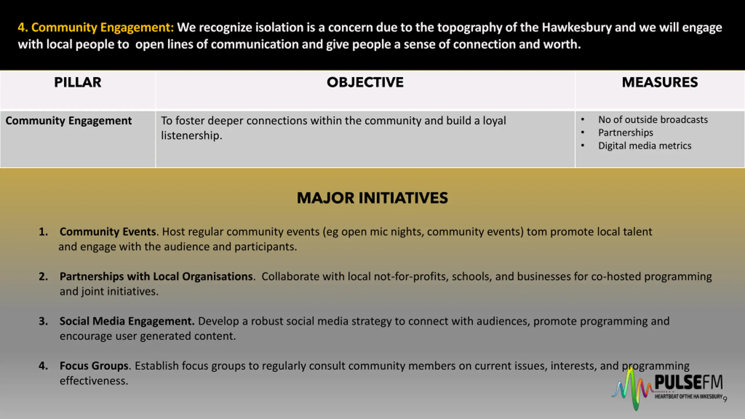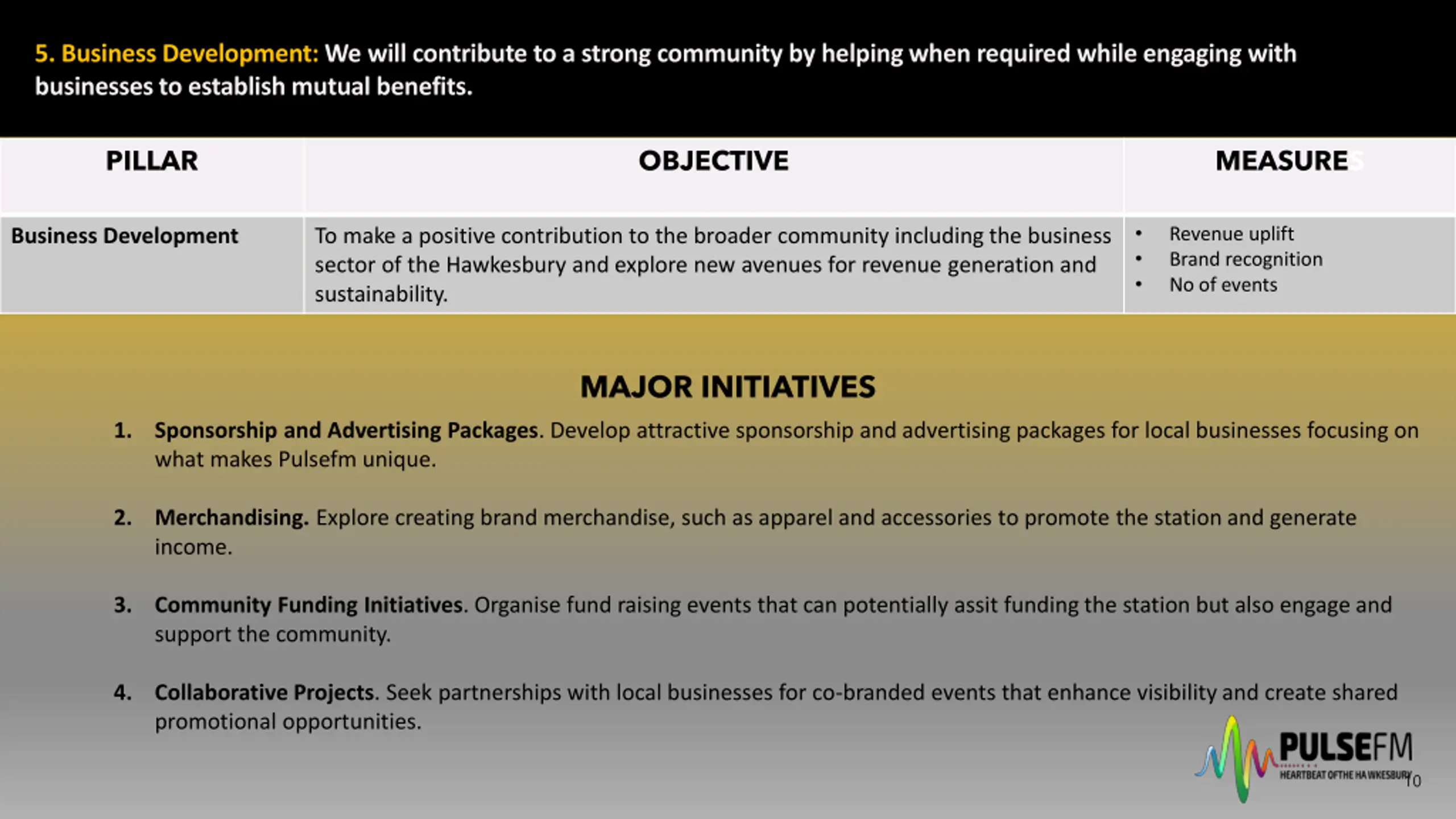 5. Business Development: We will contribute to a strong community by helping when required while engaging with businesses to establish mutual benefits. PILLAR OBJECTIVE MEASURES Revenue uplift Brand recognition No of events Business Development To make a positive contribution to the broader community including the business sector of the Hawkesbury and explore new avenues for revenue generation and sustainability. MAJOR INITIATIVES 1. Sponsorship and Advertising Packages. Develop attractive sponsorship and advertising packages for local businesses focusing on what makes Pulsefm unique. 2. Merchandising. Explore creating brand merchandise, such as apparel and accessories to promote the station and generate income. 3. Community Funding Initiatives. Organise fund raising events that can potentially assit funding the station but also engage and support the community. 4. Collaborative Projects. Seek partnerships with local businesses for co-branded events that enhance visibility and create shared promotional opportunities. 10