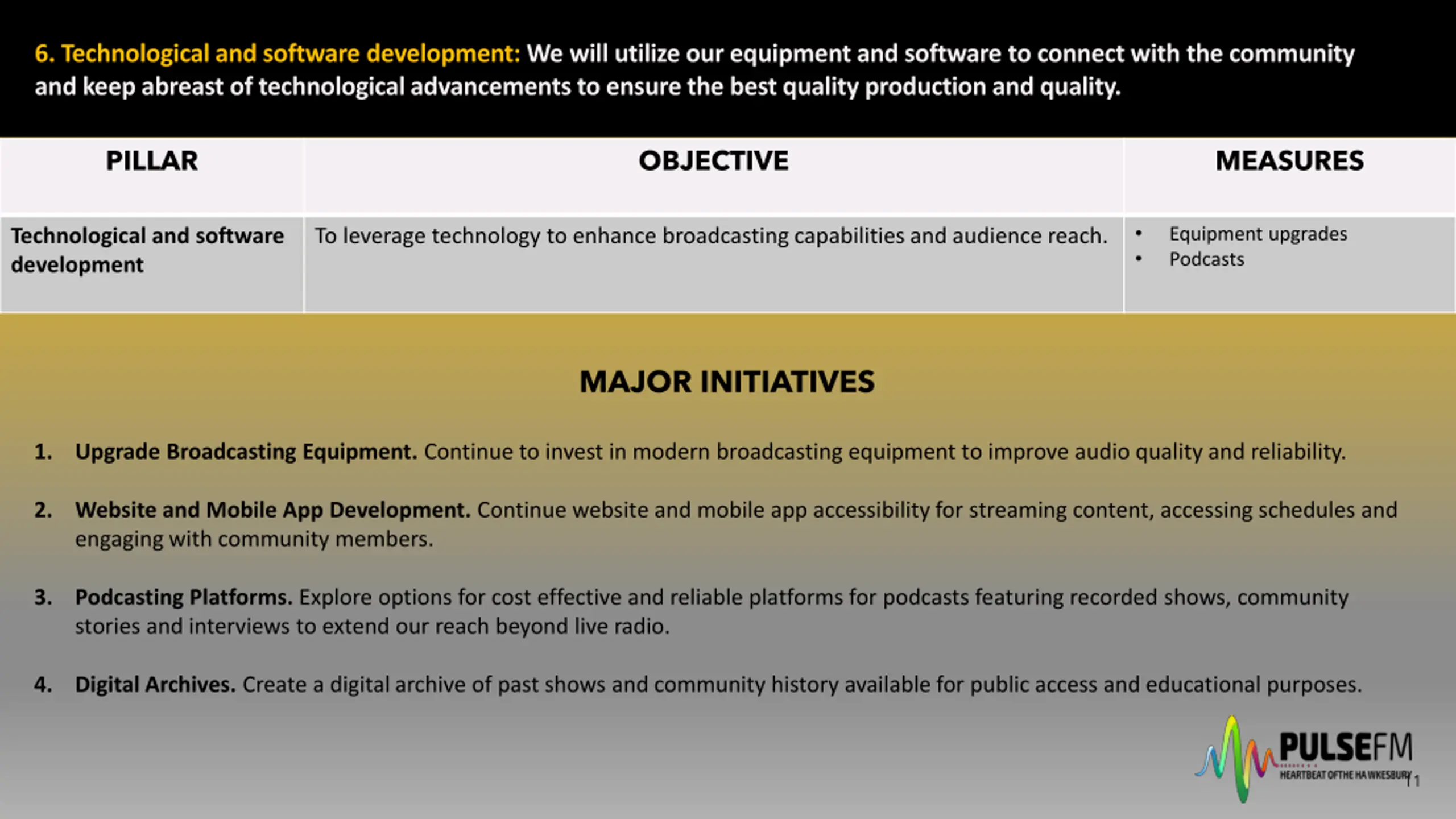 6. Technological and software development: We will utilize our equipment and software to connect with the community and keep abreast of technological advancements to ensure the best quality production and quality. PILLAR OBJECTIVE MEASURES Equipment upgrades Podcasts Technological and software development To leverage technology to enhance broadcasting capabilities and audience reach. MAJOR INITIATIVES 1. Upgrade Broadcasting Equipment. Continue to invest in modern broadcasting equipment to improve audio quality and reliability. 2. Website and Mobile App Development. Continue website and mobile app accessibility for streaming content, accessing schedules and engaging with community members. 3. Podcasting Platforms. Explore options for cost effective and reliable platforms for podcasts featuring recorded shows, community stories and interviews to extend our reach beyond live radio. 4. Digital Archives. Create a digital archive of past shows and community history available for public access and educational purposes. 11