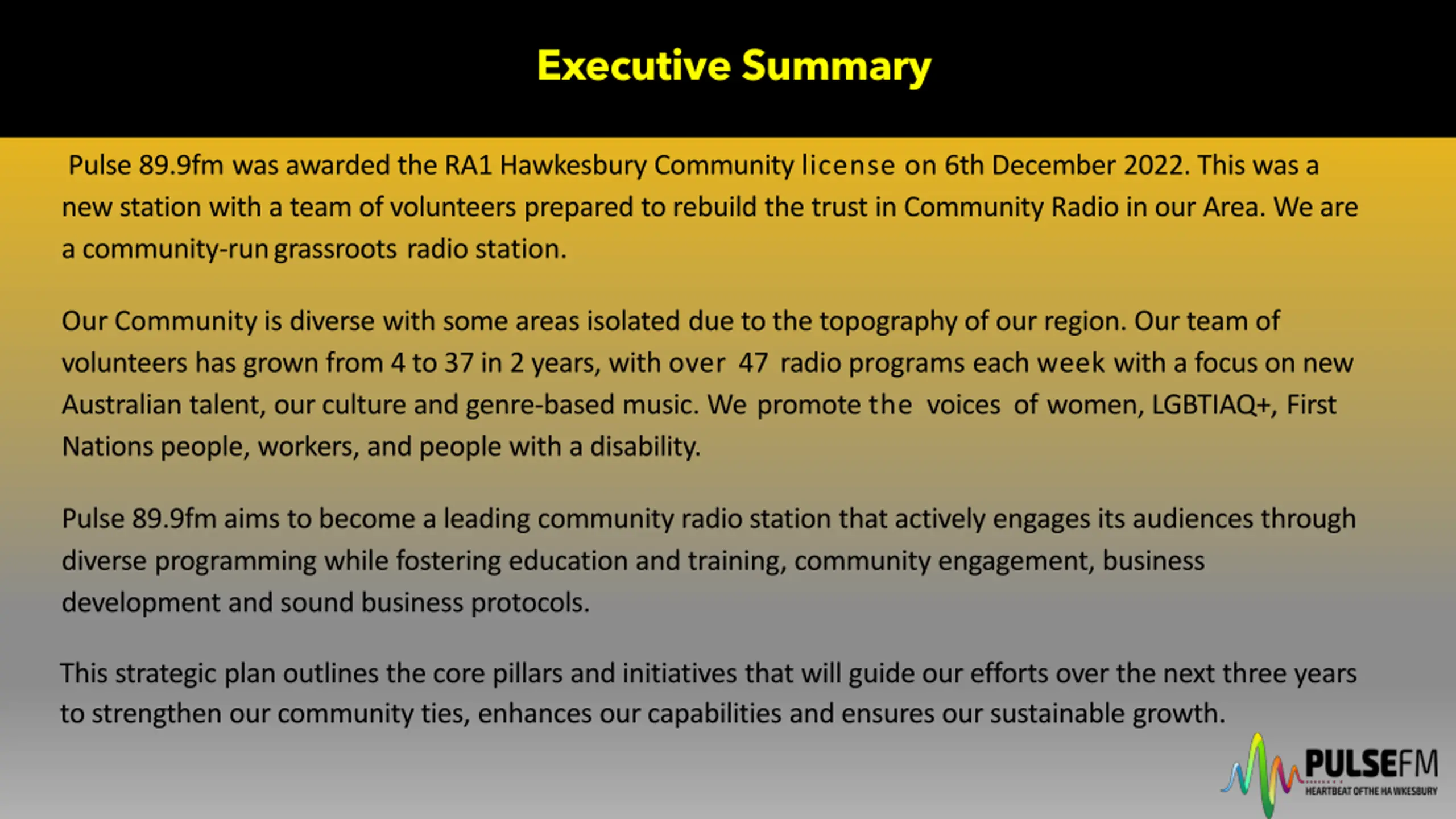 Executive Summary Pulse 89.9fm was awarded the RA1 Hawkesbury Community license on 6th December 2022. This was a new station with a team of volunteers prepared to rebuild the trust in Community Radio in our Area. We are a community-run grassroots radio station. Our Community is diverse with some areas isolated due to the topography of our region. Our team of volunteers has grown from 4 to 37 in 2 years, with over 47 radio programs each week with a focus on new Australian talent, our culture and genre-based music. We promote the voices of women, LGBTIAQ+, First Nations people, workers, and people with a disability. Pulse 89.9fm aims to become a leading community radio station that actively engages its audiences through diverse programming while fostering education and training, community engagement, business development and sound business protocols. This strategic plan outlines the core pillars and initiatives that will guide our efforts over the next three years to strengthen our community ties, enhances our capabilities and ensures our sustainable growth.