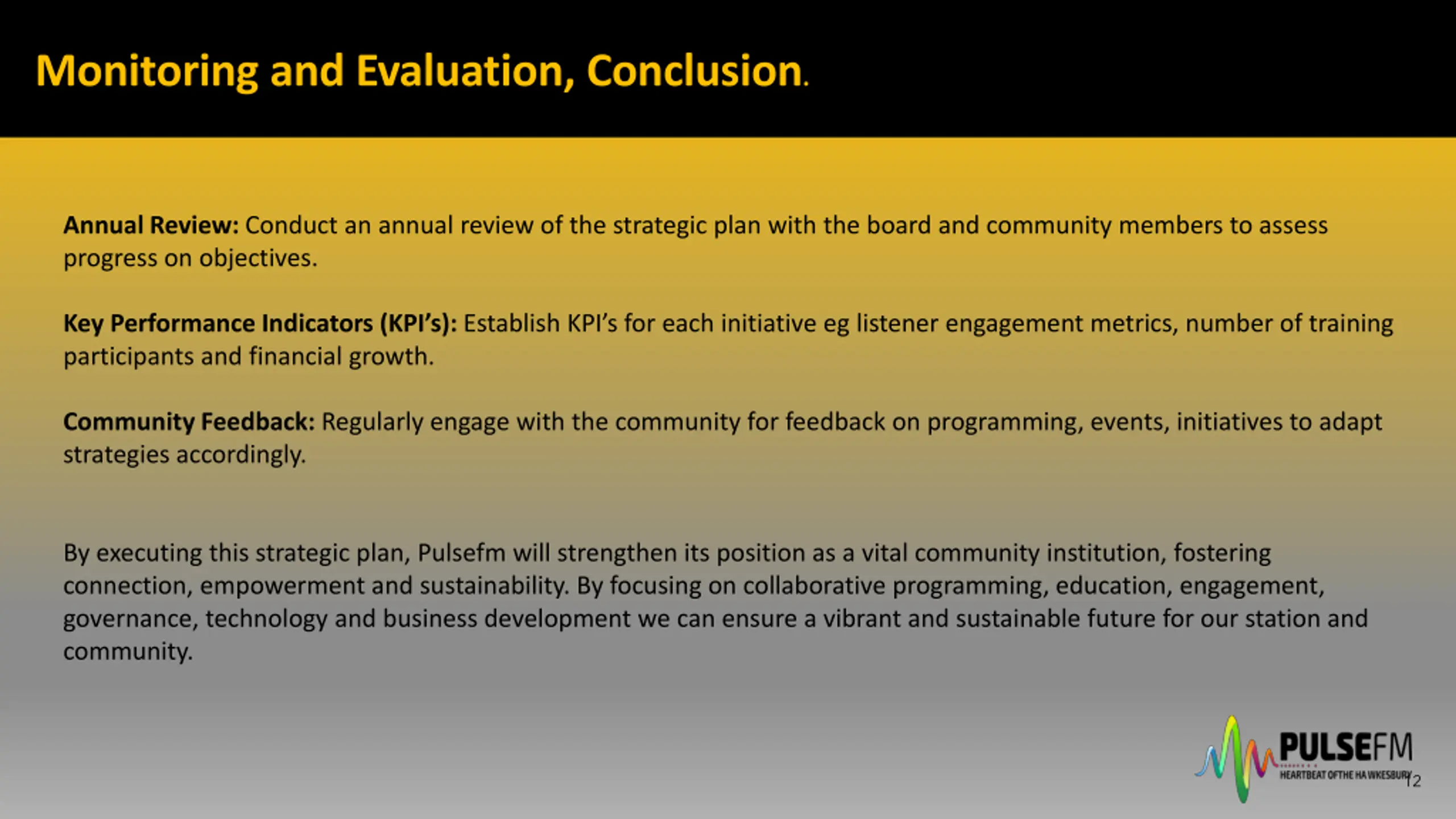 Monitoring and Evaluation, Conclusion. Annual Review: Conduct an annual review of the strategic plan with the board and community members to assess progress on objectives. Key Performance Indicators (KPI s): Establish KPI s for each initiative eg listener engagement metrics, number of training participants and financial growth. Community Feedback: Regularly engage with the community for feedback on programming, events, initiatives to adapt strategies accordingly. By executing this strategic plan, Pulsefm will strengthen its position as a vital community institution, fostering connection, empowerment and sustainability. By focusing on collaborative programming, education, engagement, governance, technology and business development we can ensure a vibrant and sustainable future for our station and community. 12