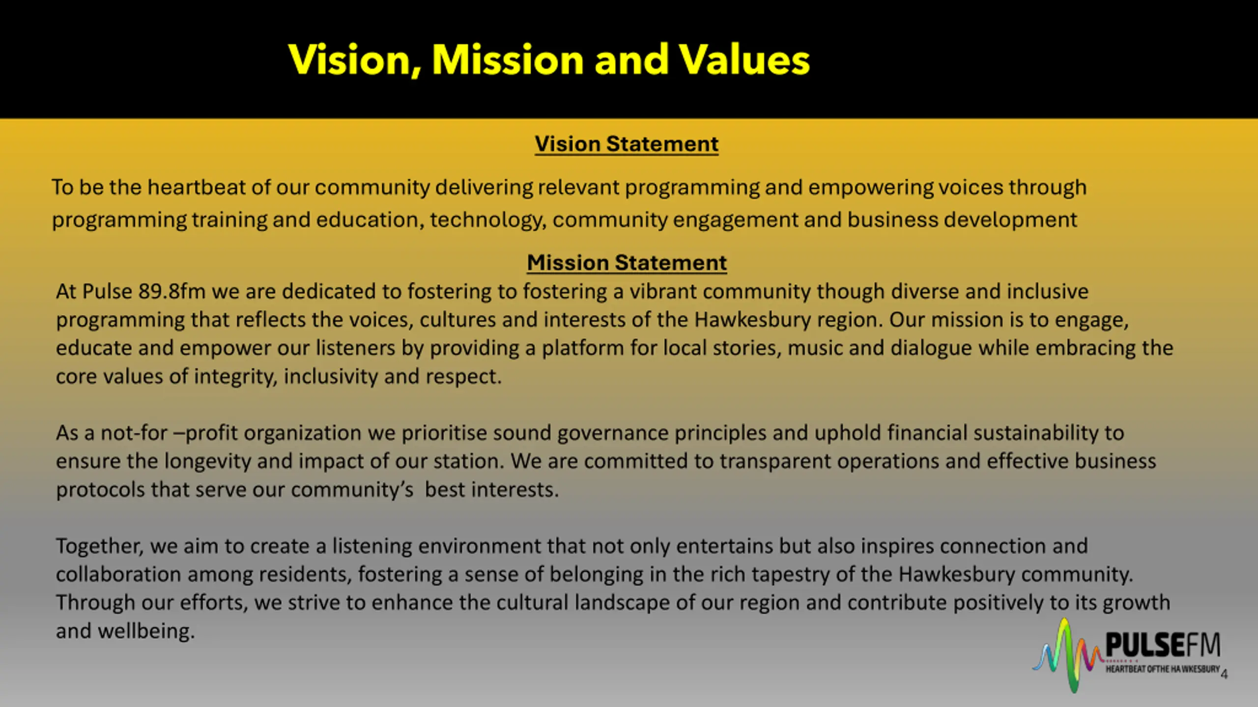 Vision, Mission and Values Vision Statement To be the heartbeat of our community delivering relevant programming and empowering voices through programming training and education, technology, community engagement and business development Mission Statement At Pulse 89.8fm we are dedicated to fostering to fostering a vibrant community though diverse and inclusive programming that reflects the voices, cultures and interests of the Hawkesbury region. Our mission is to engage, educate and empower our listeners by providing a platform for local stories, music and dialogue while embracing the core values of integrity, inclusivity and respect. As a not-for profit organization we prioritise sound governance principles and uphold financial sustainability to ensure the longevity and impact of our station. We are committed to transparent operations and effective business protocols that serve our community s best interests. Together, we aim to create a listening environment that not only entertains but also inspires connection and collaboration among residents, fostering a sense of belonging in the rich tapestry of the Hawkesbury community. Through our efforts, we strive to enhance the cultural landscape of our region and contribute positively to its growth and wellbeing. 4