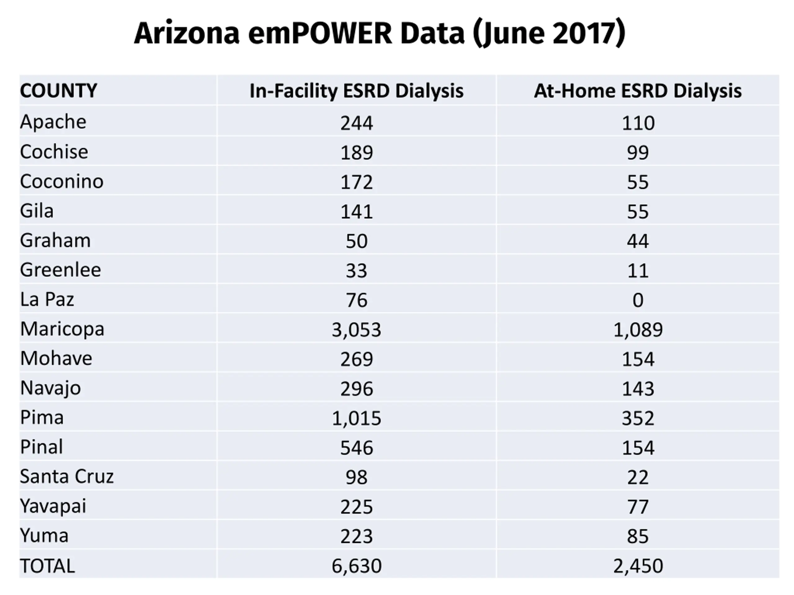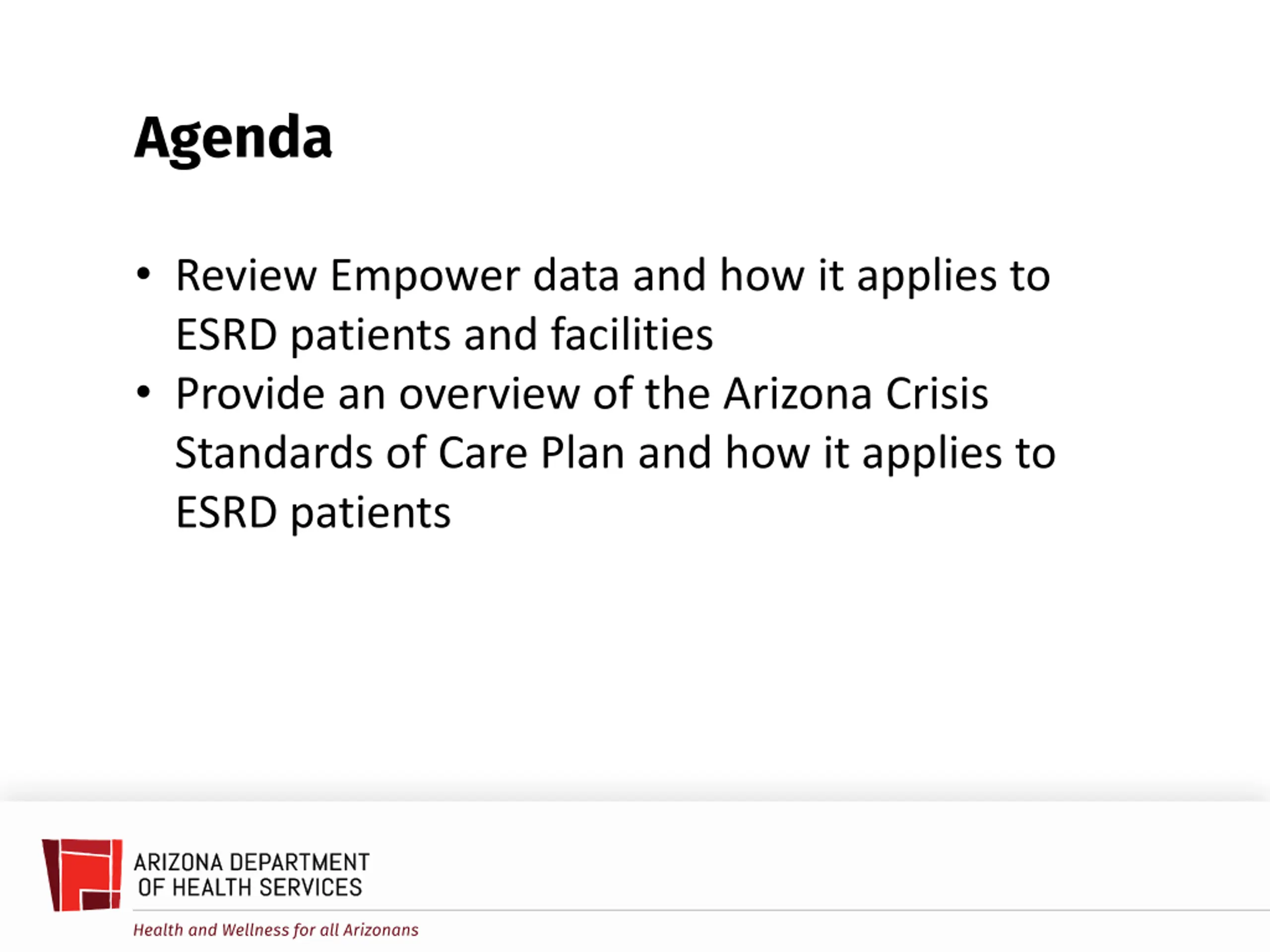 Agenda Review Empower data and how it applies to ESRD patients and facilities Provide an overview of the Arizona Crisis Standards of Care Plan and how it applies to ESRD patients
