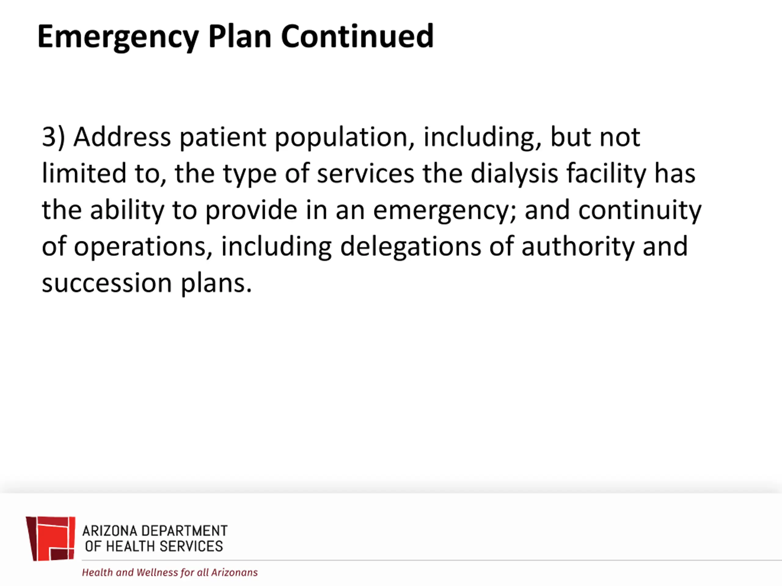 Emergency Plan Continued 3) Address patient population, including, but not limited to, the type of services the dialysis facility has the ability to provide in an emergency; and continuity of operations, including delegations of authority and succession plans.