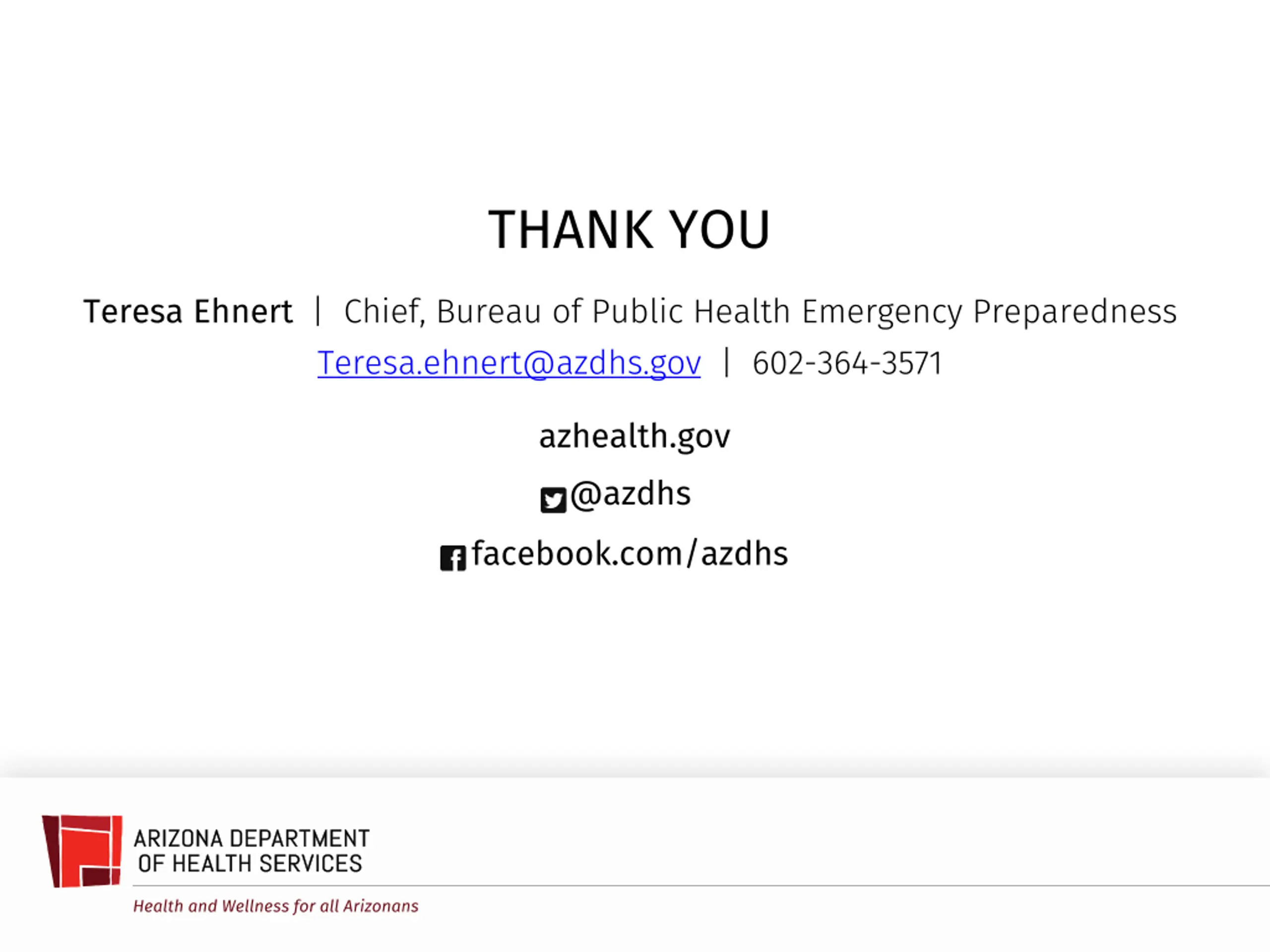 THANK YOU Teresa Ehnert | Chief, Bureau of Public Health Emergency Preparedness Teresa.ehnert@azdhs.gov | 602-364-3571 azhealth.gov @azdhs facebook.com/azdhs