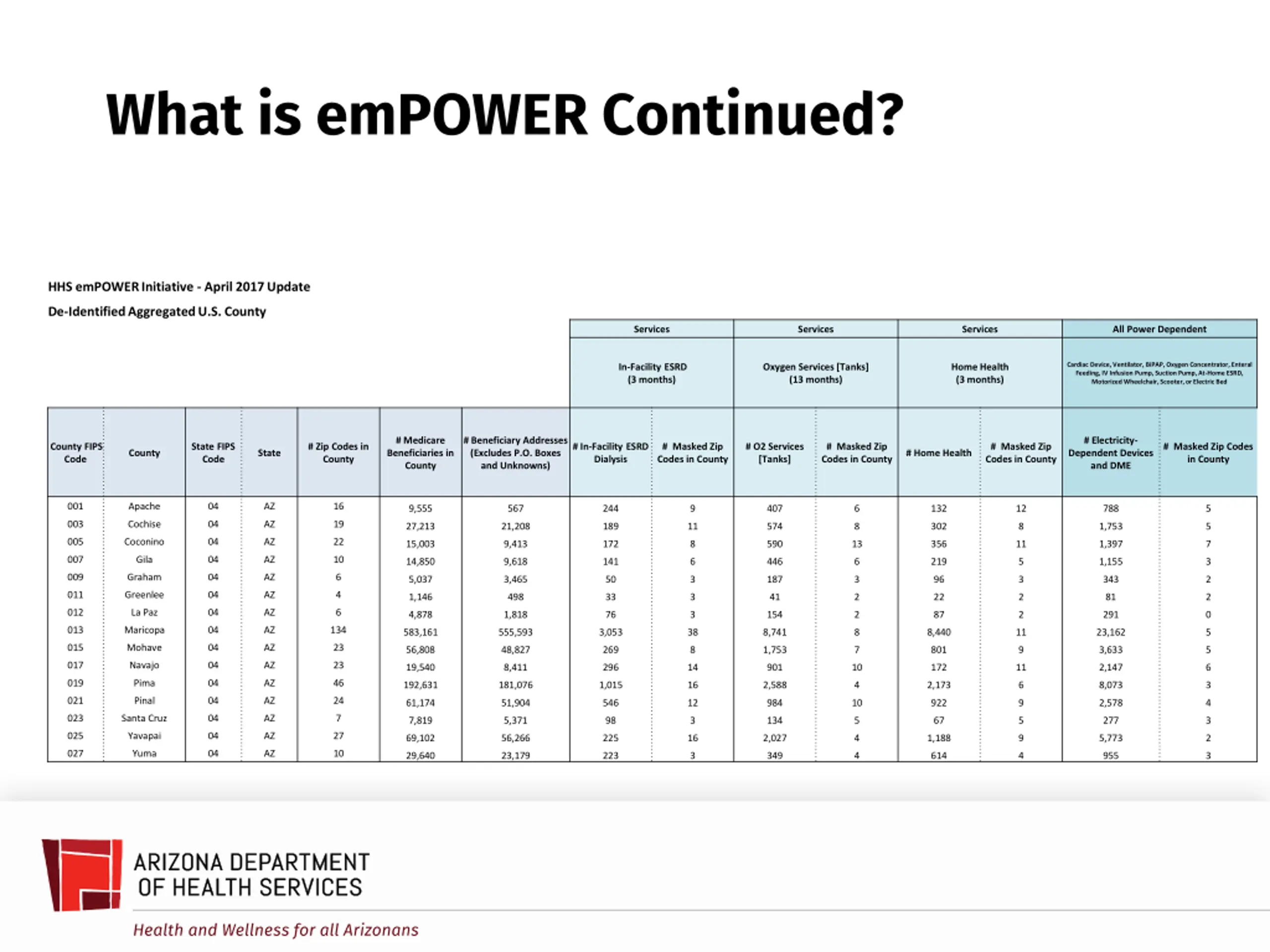 What is emPOWER Continued? HHS emPOWER Initiative - April 2017 Update De-Identified Aggregated U.S. County Services Services Services All Power Dependent Cardiac Device, Ventilator, BiPAP, Oxygen Concentrator, Enteral Feeding, IV Infusion Pump, Suction Pump, At-Home ESRD, Motorized Wheelchair, Scooter, or Electric Bed In-Facility ESRD (3 months) Oxygen Services [Tanks] (13 months) Home Health (3 months) # Medicare Beneficiaries in County # Beneficiary Addresses (Excludes P.O. Boxes and Unknowns) # Electricity- Dependent Devices and DME County FIPS Code State FIPS Code # Zip Codes in County # In-Facility ESRD Dialysis # Masked Zip Codes in County # O2 Services [Tanks] # Masked Zip Codes in County # Masked Zip Codes in County # Masked Zip Codes in County County State # Home Health 001 Apache 04 AZ 16 9,555 567 244 9 407 6 132 12 788 5 003 Cochise 04 AZ 19 27,213 21,208 189 11 574 8 302 8 1,753 5 005 Coconino 04 AZ 22 15,003 9,413 172 8 590 13 356 11 1,397 7 007 Gila 04 AZ 10 14,850 9,618 141 6 446 6 219 5 1,155 3 009 Graham 04 AZ 6 5,037 3,465 50 3 187 3 96 3 343 2 011 Greenlee 04 AZ 4 1,146 498 33 3 41 2 22 2 81 2 012 La Paz 04 AZ 6 4,878 1,818 76 3 154 2 87 2 291 0 013 Maricopa 04 AZ 134 583,161 555,593 3,053 38 8,741 8 8,440 11 23,162 5 015 Mohave 04 AZ 23 56,808 48,827 269 8 1,753 7 801 9 3,633 5 017 Navajo 04 AZ 23 19,540 8,411 296 14 901 10 172 11 2,147 6 019 Pima 04 AZ 46 192,631 181,076 1,015 16 2,588 4 2,173 6 8,073 3 021 Pinal 04 AZ 24 61,174 51,904 546 12 984 10 922 9 2,578 4 023 Santa Cruz 04 AZ 7 7,819 5,371 98 3 134 5 67 5 277 3 025 Yavapai 04 AZ 27 69,102 56,266 225 16 2,027 4 1,188 9 5,773 2 027 Yuma 04 AZ 10 29,640 23,179 223 3 349 4 614 4 955 3