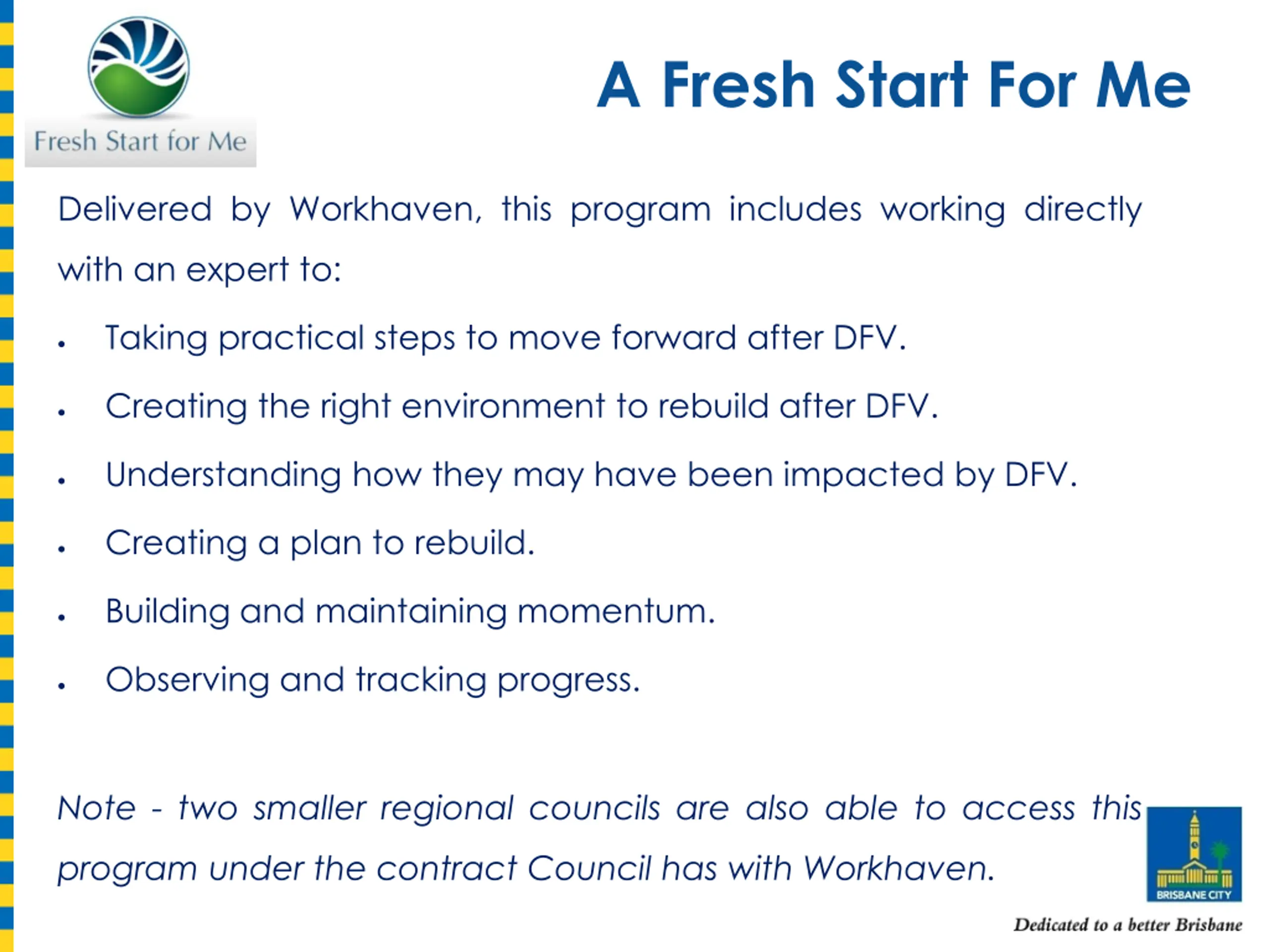 A Fresh Start For Me Delivered by Workhaven, this program includes working directly with an expert to: Taking practical steps to move forward after DFV. Creating the right environment to rebuild after DFV. Understanding how they may have been impacted by DFV. Creating a plan to rebuild. Building and maintaining momentum. Observing and tracking progress. Note - two smaller regional councils are also able to access this program under the contract Council has with Workhaven.